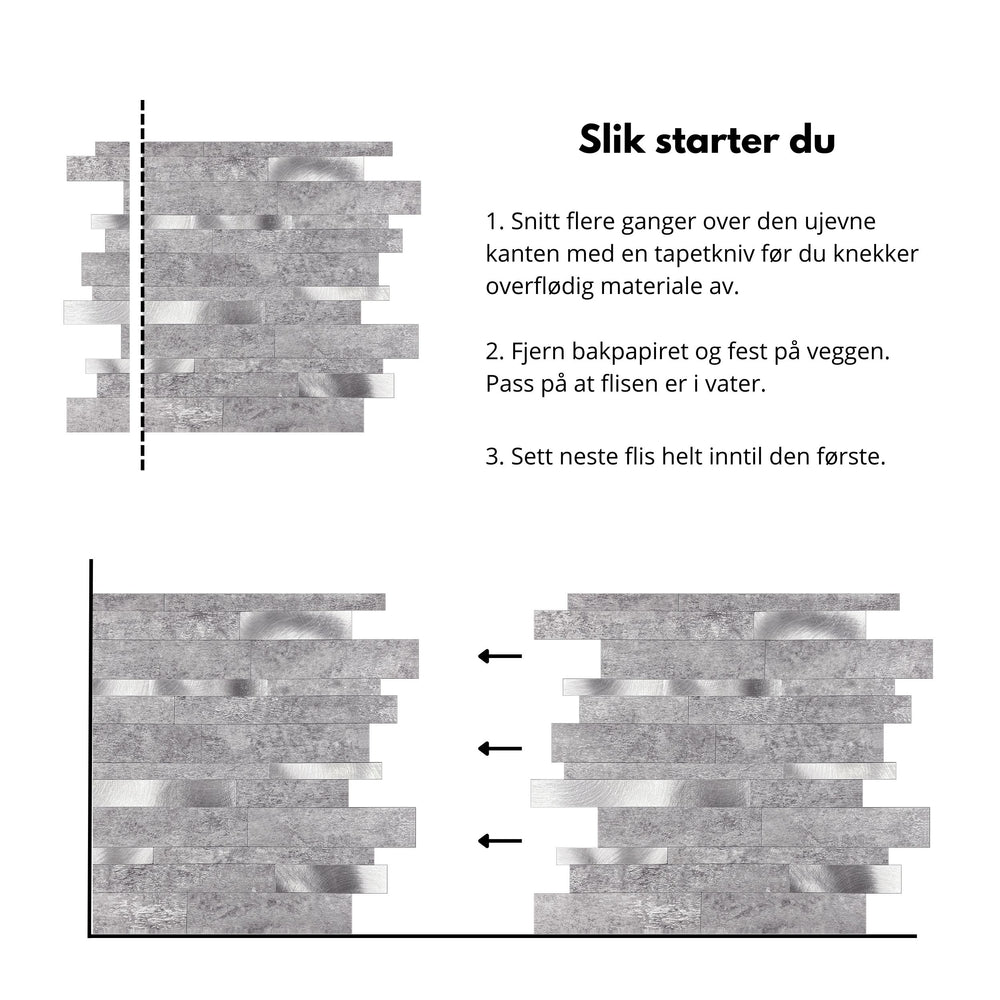 Du sparer både tid og penger med selvklebende veggfliser. Flisene monteres direkte på din eksisterende vegg, og er perfekt som sprutvegg og ellers på kjøkken, bad, vaskerom og gang.