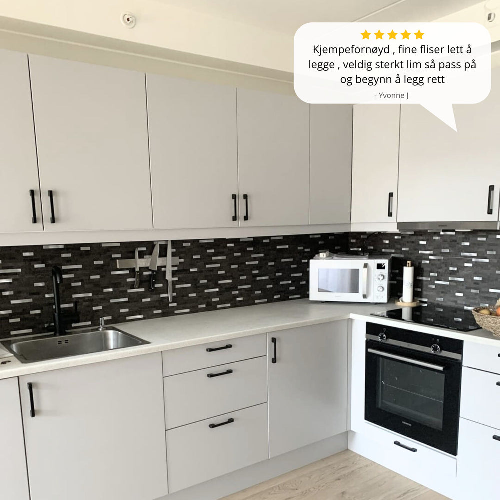 Stein mørk grå selvklebende veggfliser kombinerer rå steinlook med elegant metallisk glans. Flisene imiterer stavmosaikk i mørke gråtoner, med børstet aluminium som gir en sofistikert dybde og struktur.