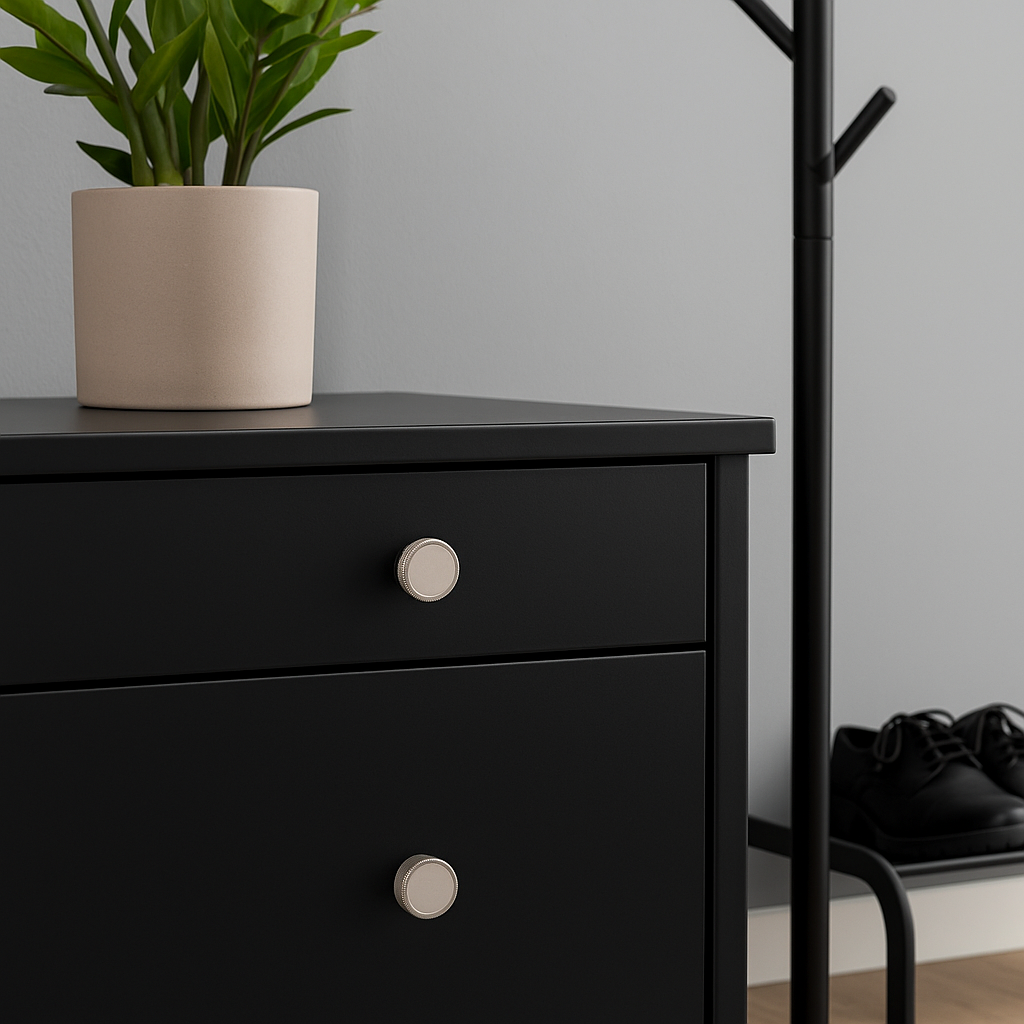 Knotter i børstet stål på sort kommode i gang. Grønn plante, sorte sko og stumtjener skaper et stilrent og moderne uttrykk.