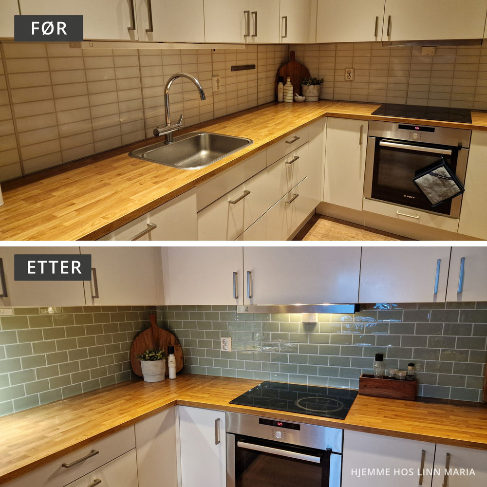 Lyst kjøkken med Subway Sage Green selvklebende veggfliser som gir frisk og moderne stil.