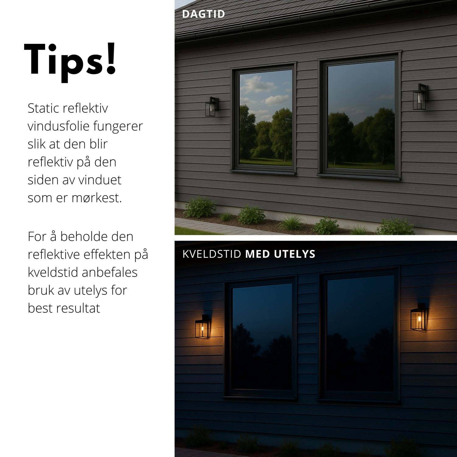 Supreme Static Reflektiv gir effektiv solskjerming og skjerming av innsyn med en elegant speileffekt på dagtid. Denne selvklebende folien gjør det mulig å se ut, samtidig som den hindrer innsyn utenfra, noe som gir deg økt privatliv og komfort i hjemmet. På kveldstid, når det er mørkt ute og lyst inne, kan du bruke utelys for å bevare den reflektive effekten. Folien er ikke egnet på rom man ønsker fullstendig skjerming døgnet rundt, f.eks bad.