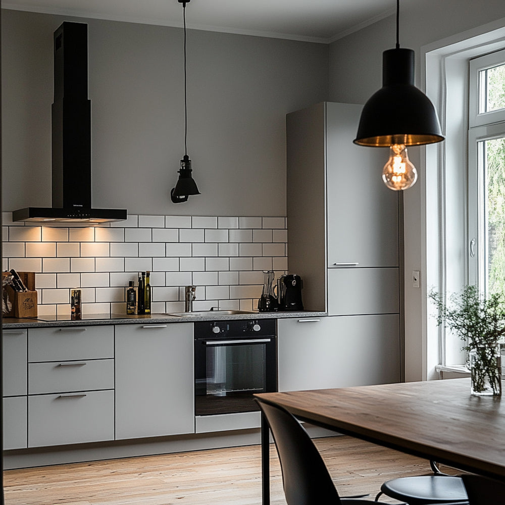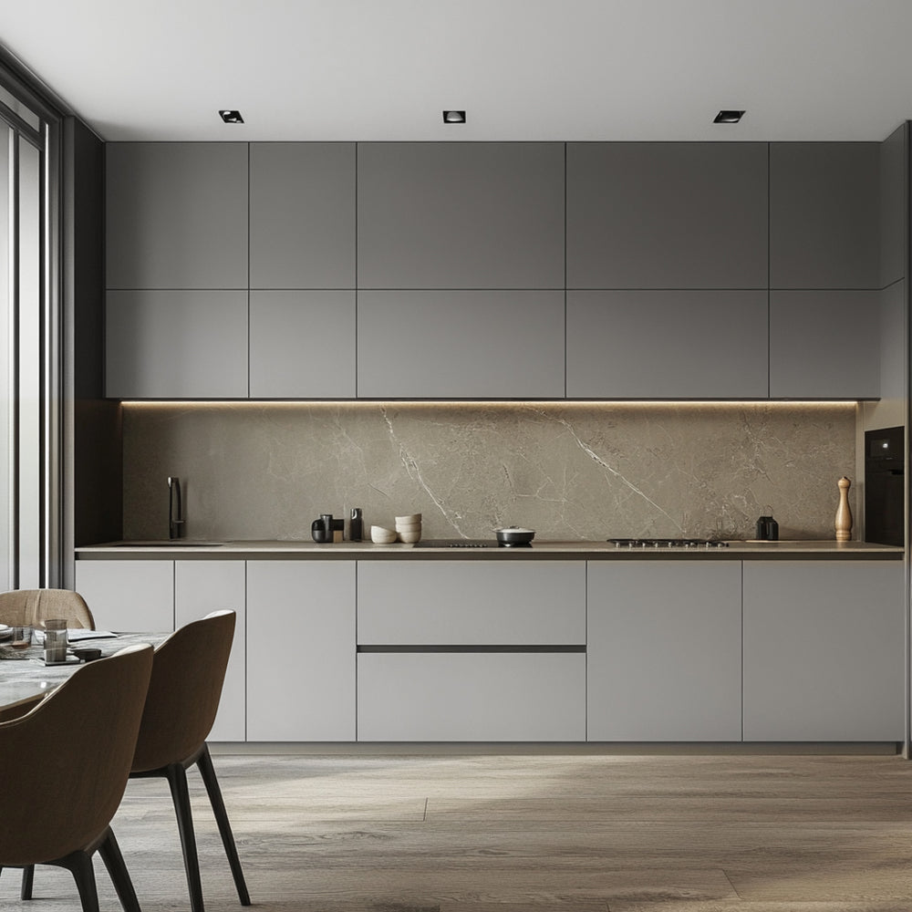 Moderne kjøkken med Uni Matt Grå kontaktplast på skapdørene og hvite fliser som gir et stilrent og tidløst uttrykk