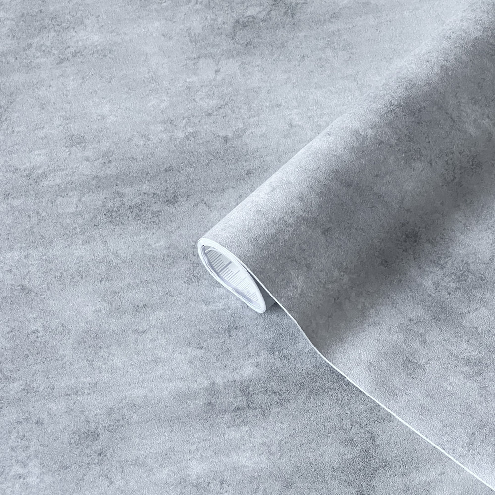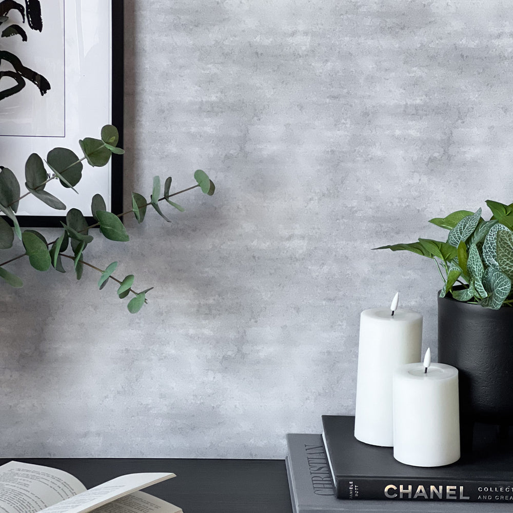 Betonggrå kontaktplast har et lyst grått stein- eller betonginspirert mønster.
