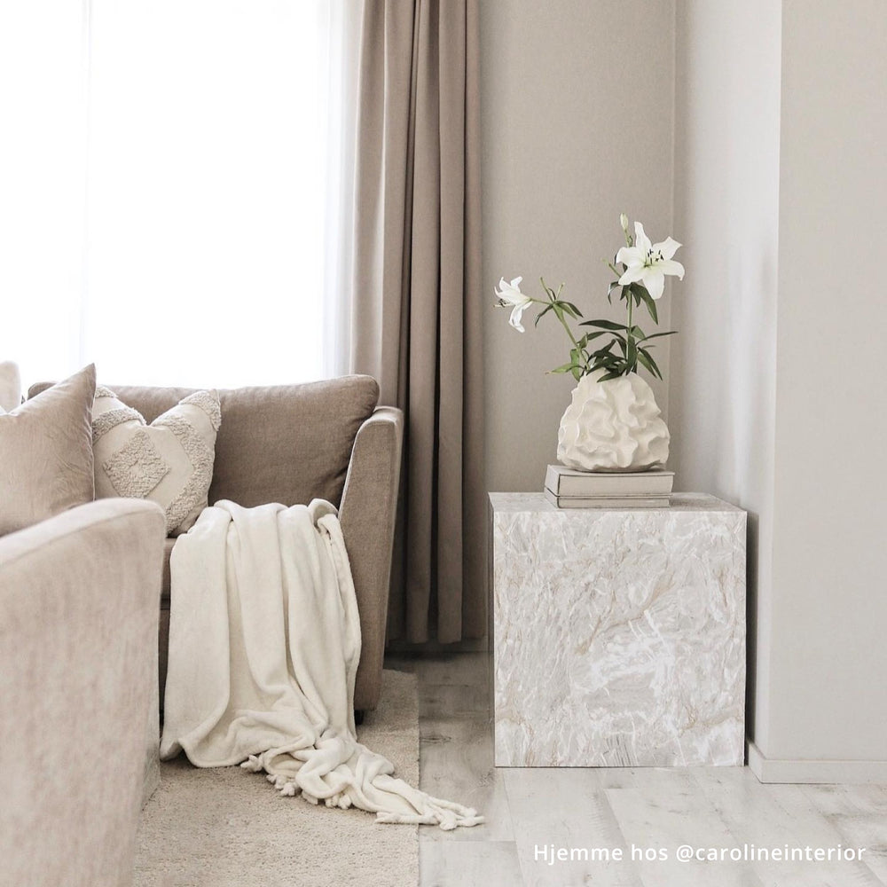 Cortes marmor kontaktplast er en klar kundefavoritt og ikke uten grunn! Den har en nydelig marmorisering i beige og gyldne toner. Den har faktisk blitt så populær at det har blitt en trend på Instagram å lage sitt eget stuebord med den.