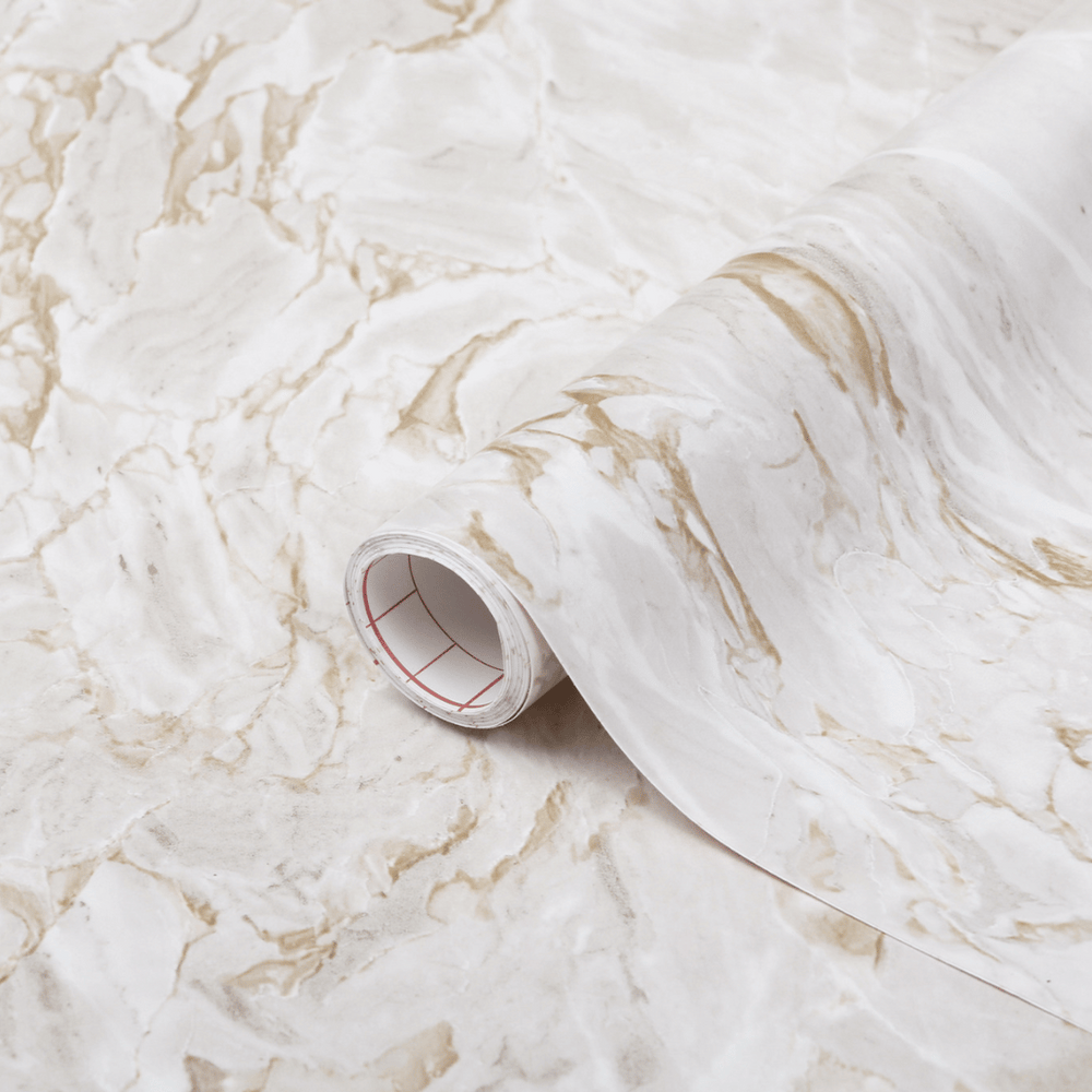 Folien har en marmoreffekt med en overflate som kombinerer lys beige og kremfargede toner med markante, bølgende årer i en mørkere beige eller gyllen farge. Mønsteret er mer dynamisk og har en livlig tekstur, som gir et inntrykk av naturlig stein med organisk utseende.