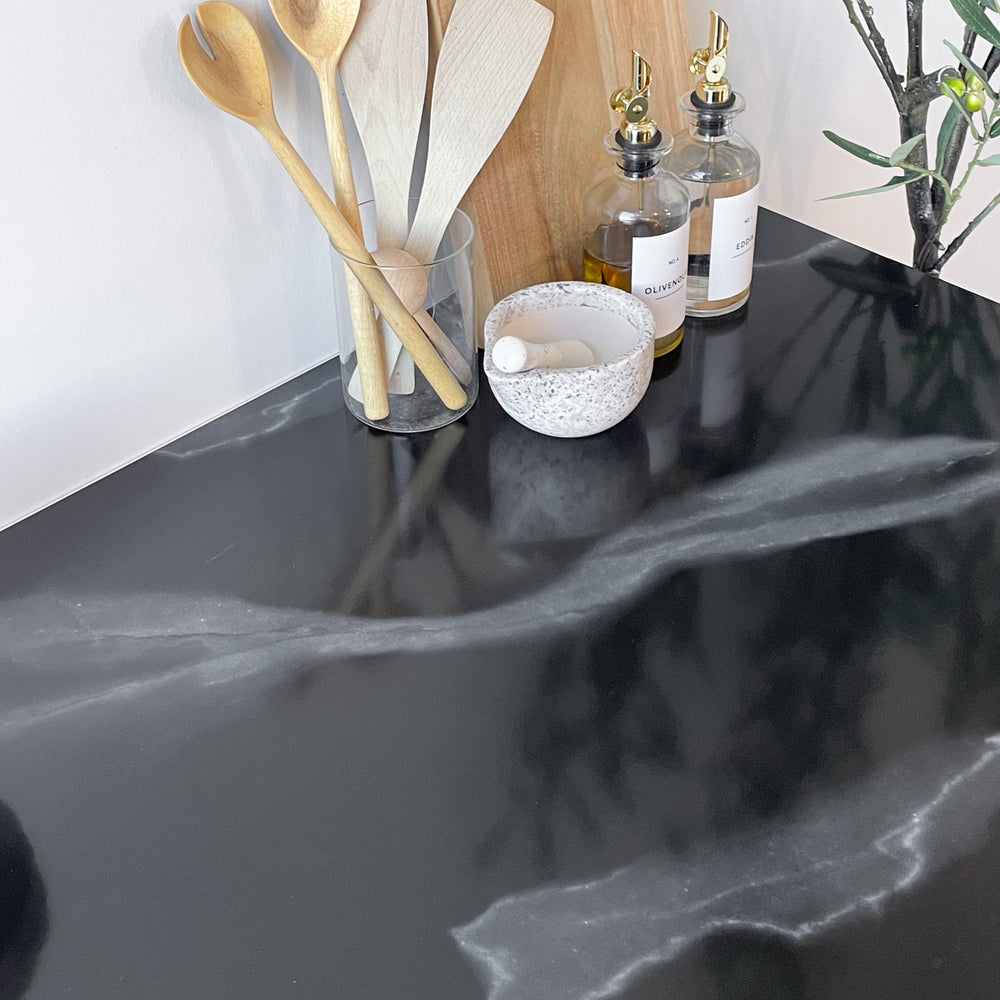 Klassisk marmor sort kontaktplast er en nydelig selvklebende i folie i sort glossy bakgrunn med hvit marmorering. Marmoreringen strekker seg over lengre deler av folien for å få et klassisk uttrykk.