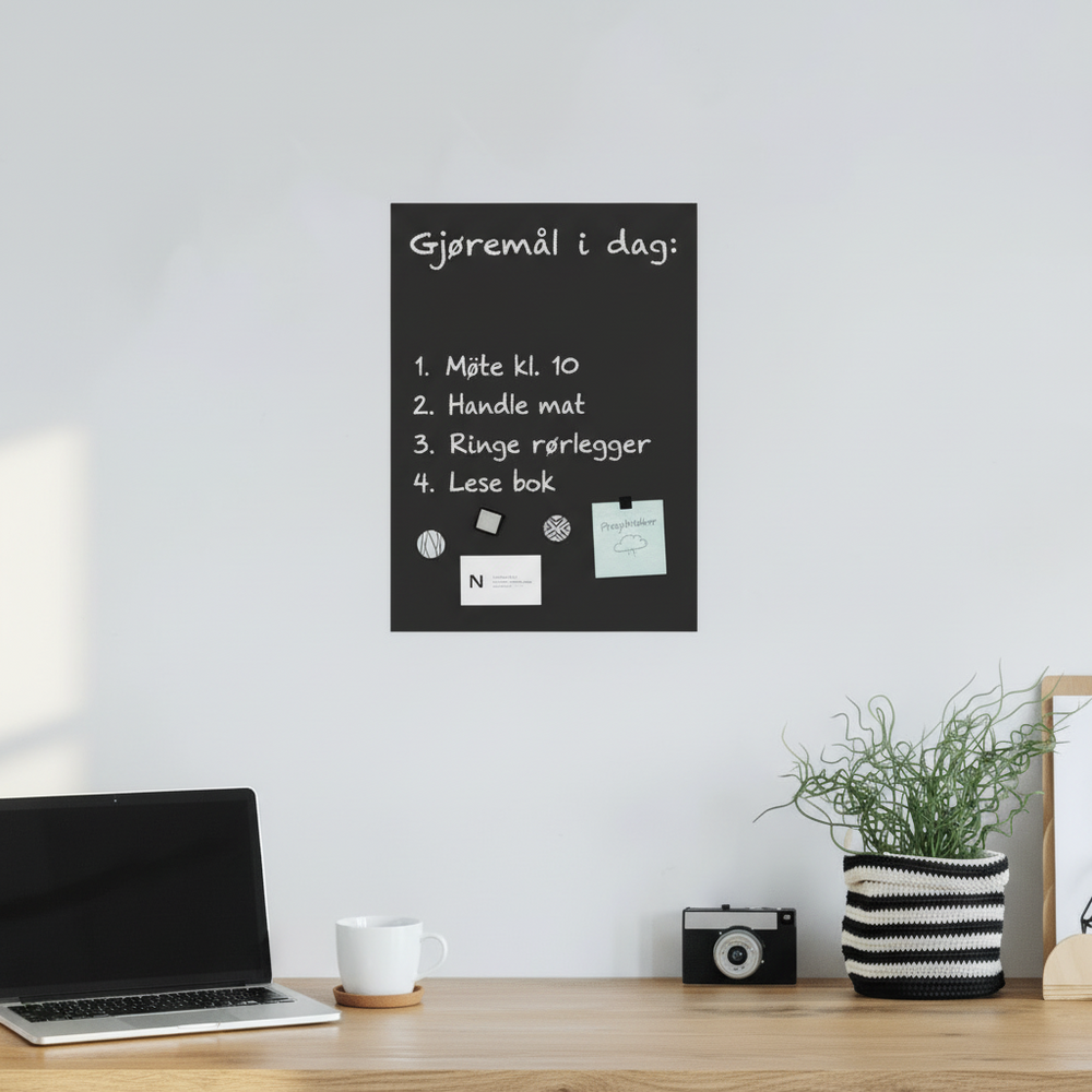 Magnetisk tavlefolie i topp kvalitet. Folien kommer med ferdig med lim på baksiden, så det eneste du trenger å gjøre er å fjerne beskyttelsespapiret og feste den der du ønsker. Fest den på kjøleskapet, over skrivepulten eller i kjøkken/baderomsskapet. Perfekt for to-do-list, handelister eller som tegnebrett.