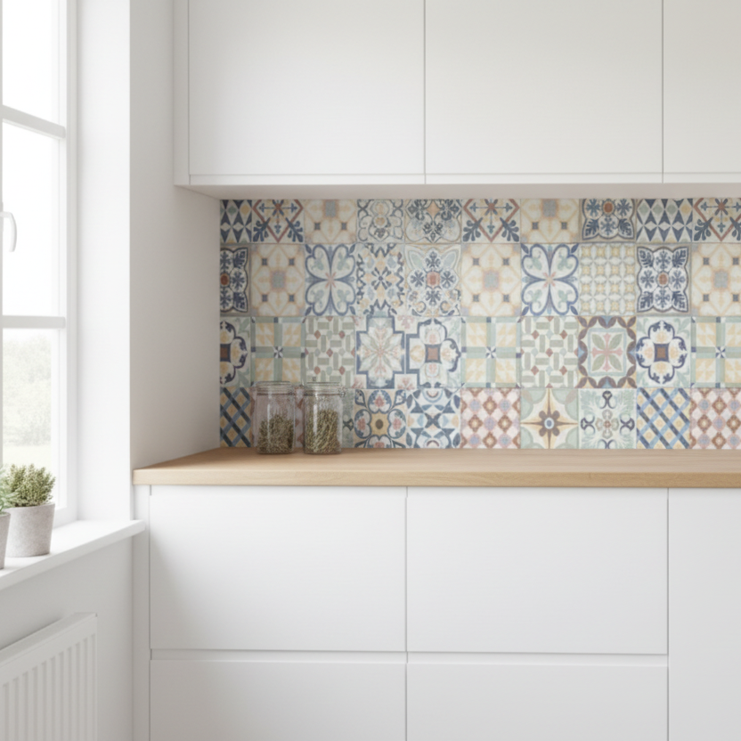 Designet består av ulike flisemotiver satt sammen i et gjennomgående uttrykk. Fargene er dempet og varme, noe som gjør at mønsteret skiller seg ut uten å bli for dominerende. På vegger, kommoder og skapdører gir det et tydelig løft uten at du må bytte ut noe.