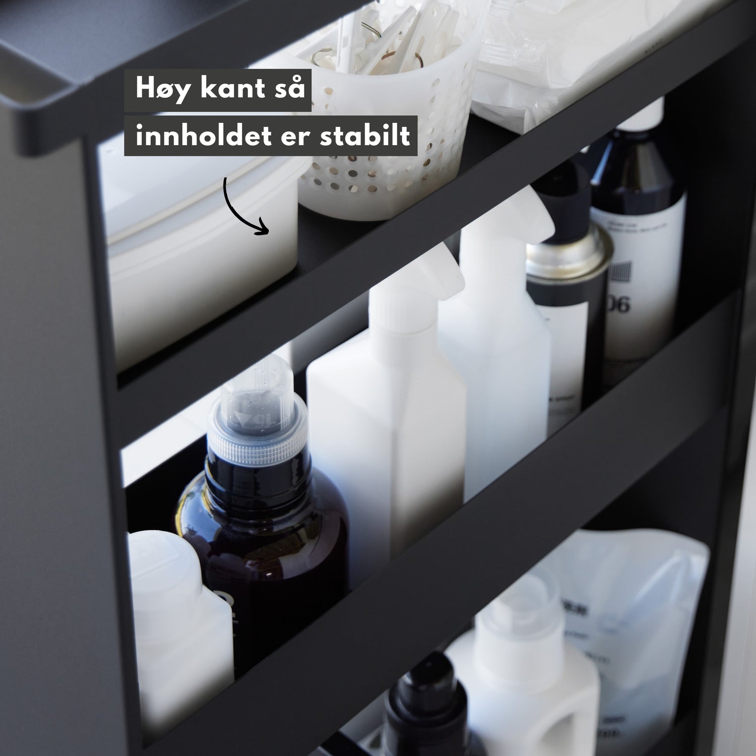 Denne funksjonelle oppbevaringsvognen gir deg enkel tilgang til alt du trenger på bad, vaskerom eller kjøkken. Med fire åpne hyller og smal utforming passer den perfekt inn i små mellomrom, som mellom maskiner eller skap.
