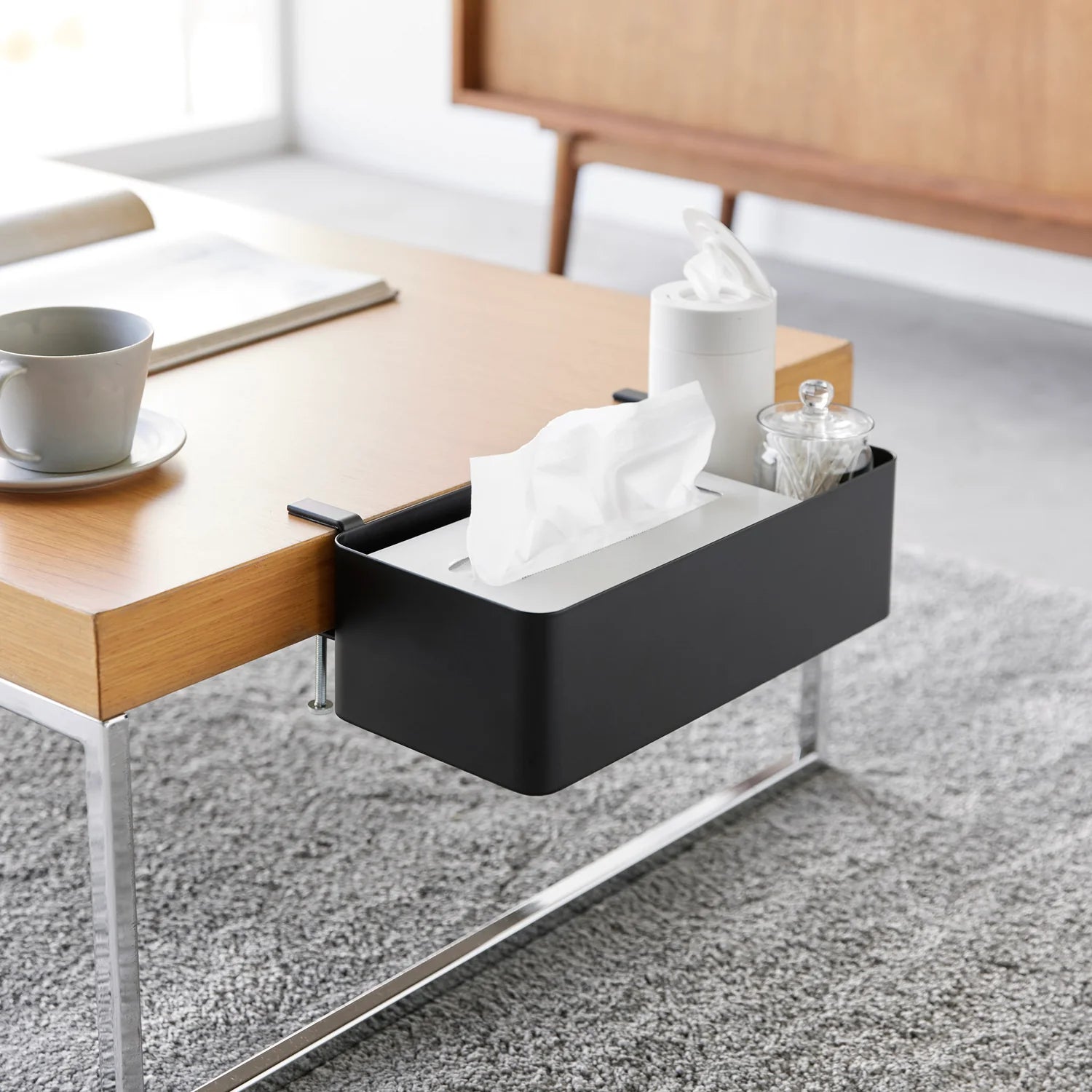Produktet er en solid metallboks som festes direkte på kanten av bordet. Med klemmefestet strammer du den enkelt fast under bordplaten, og boksen henger trygt på siden av bordet.