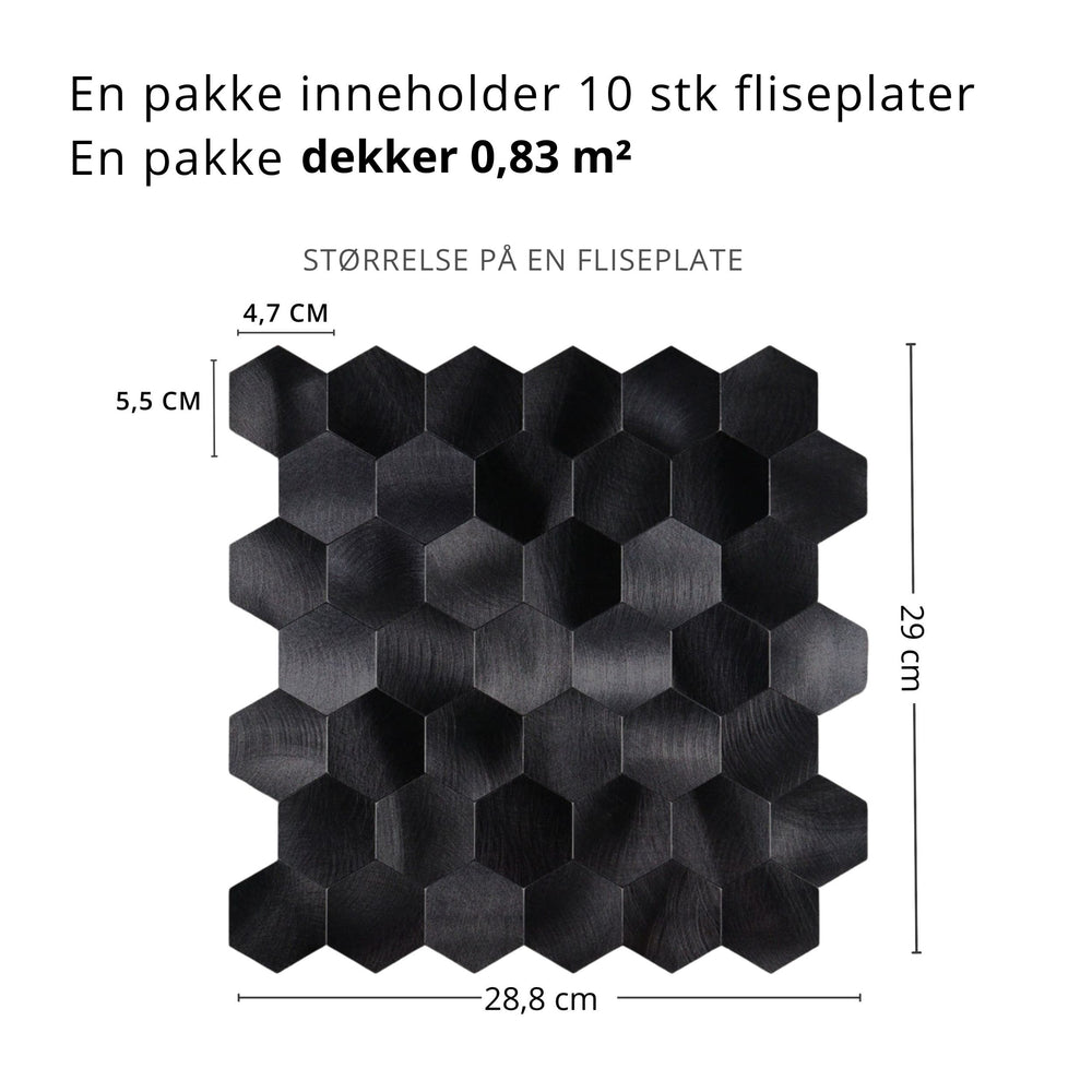 10-pk Midnatt hexagon selvklebende veggfliser regnes som en permanent løsning. Dersom man ønsker å kunne lett fjerne flisene i ettertid anbefaler vi å feste kontaktplast mellom underlaget og flisene.