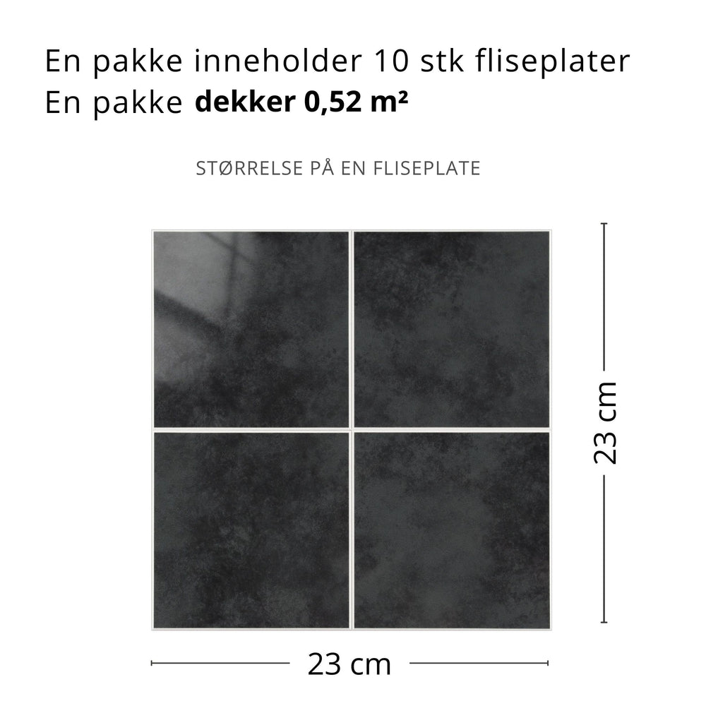 10-pk Melina antrasitt selvklebende veggfliser regnes som en permanent løsning. Dersom man ønsker å kunne lett fjerne flisene i ettertid anbefaler vi å feste kontaktplast mellom underlaget og flisene.