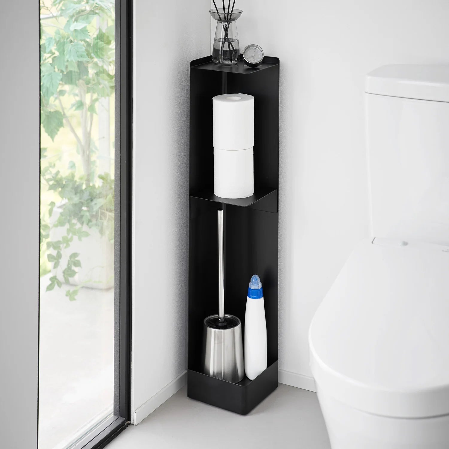 Få et ryddigere bad med en smal toalettpapirholder som gjør det enkelt å oppbevare både toalettruller og små rengjøringsartikler på en diskret måte. Den sorte utførelsen gir et mer markert og moderne uttrykk, samtidig som de lukkede sidene skjermer innholdet og gjør badet roligere å se på.