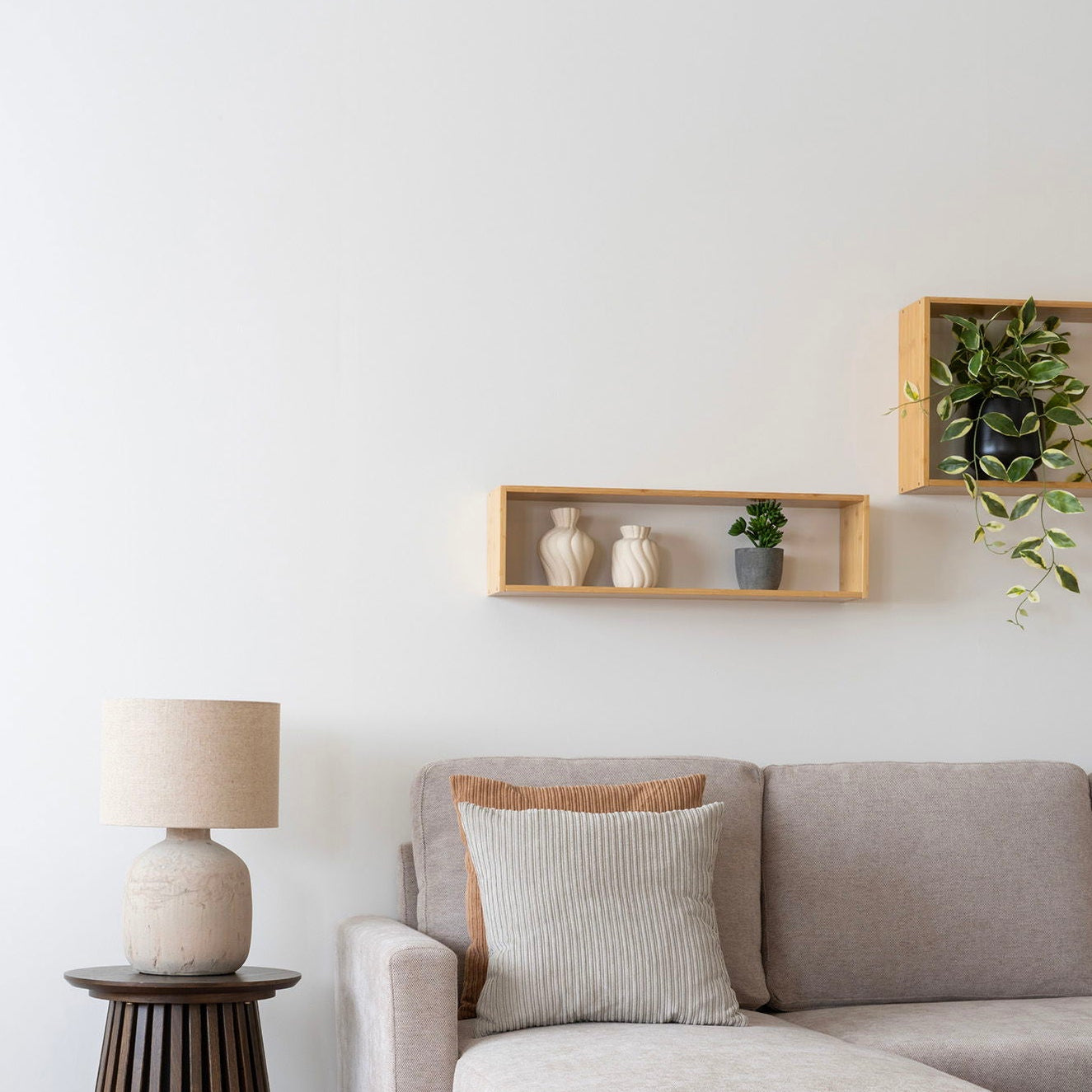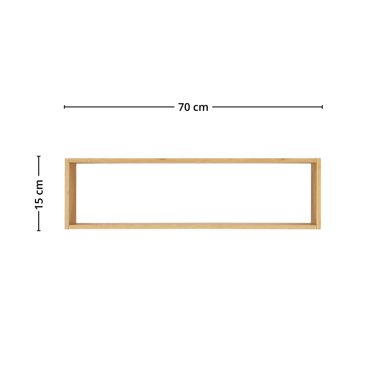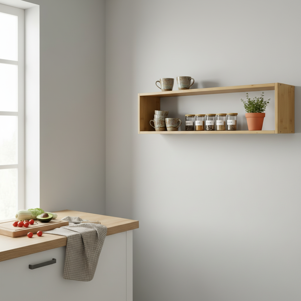 Bambus er både slitesterkt og stabilt, og gir et levende spill i overflaten som gjør hver hylle unik. Den fungerer perfekt over sofa, skrivebord, kommode eller på kjøkkenveggen for kopper og krydder.