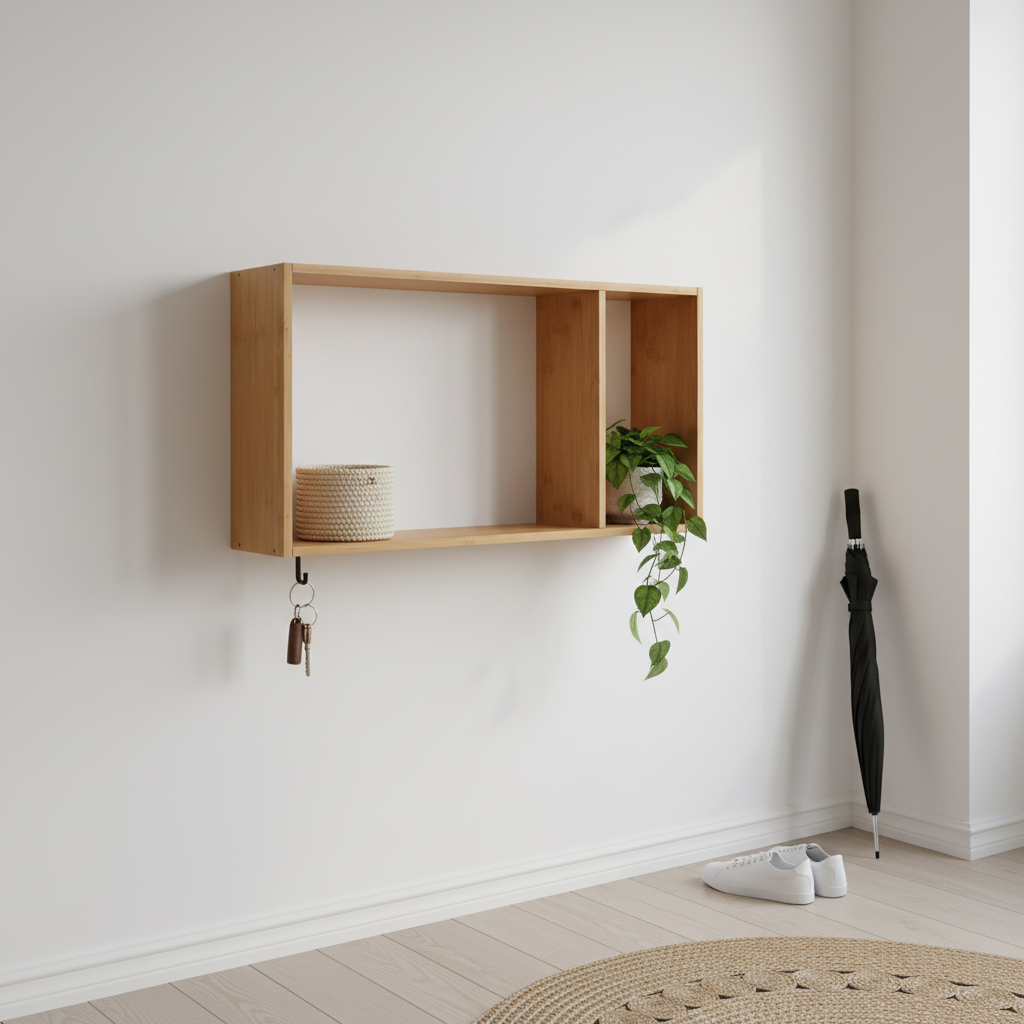 Denne vegghyllen brukes ofte i stue, gang og kjøkken for å skape et ryddig uttrykk med synlig oppbevaring og dekor i kombinasjon.