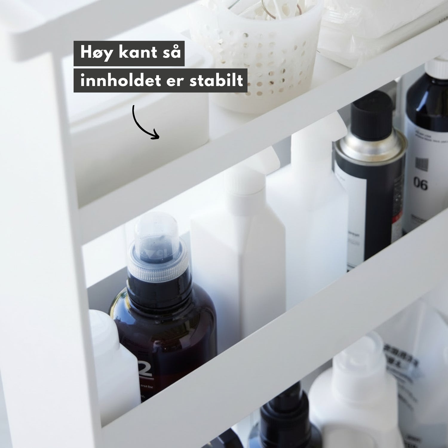 • Hyllene har høy kant som holder flasker og rengjøringsmidler stødig på plass.