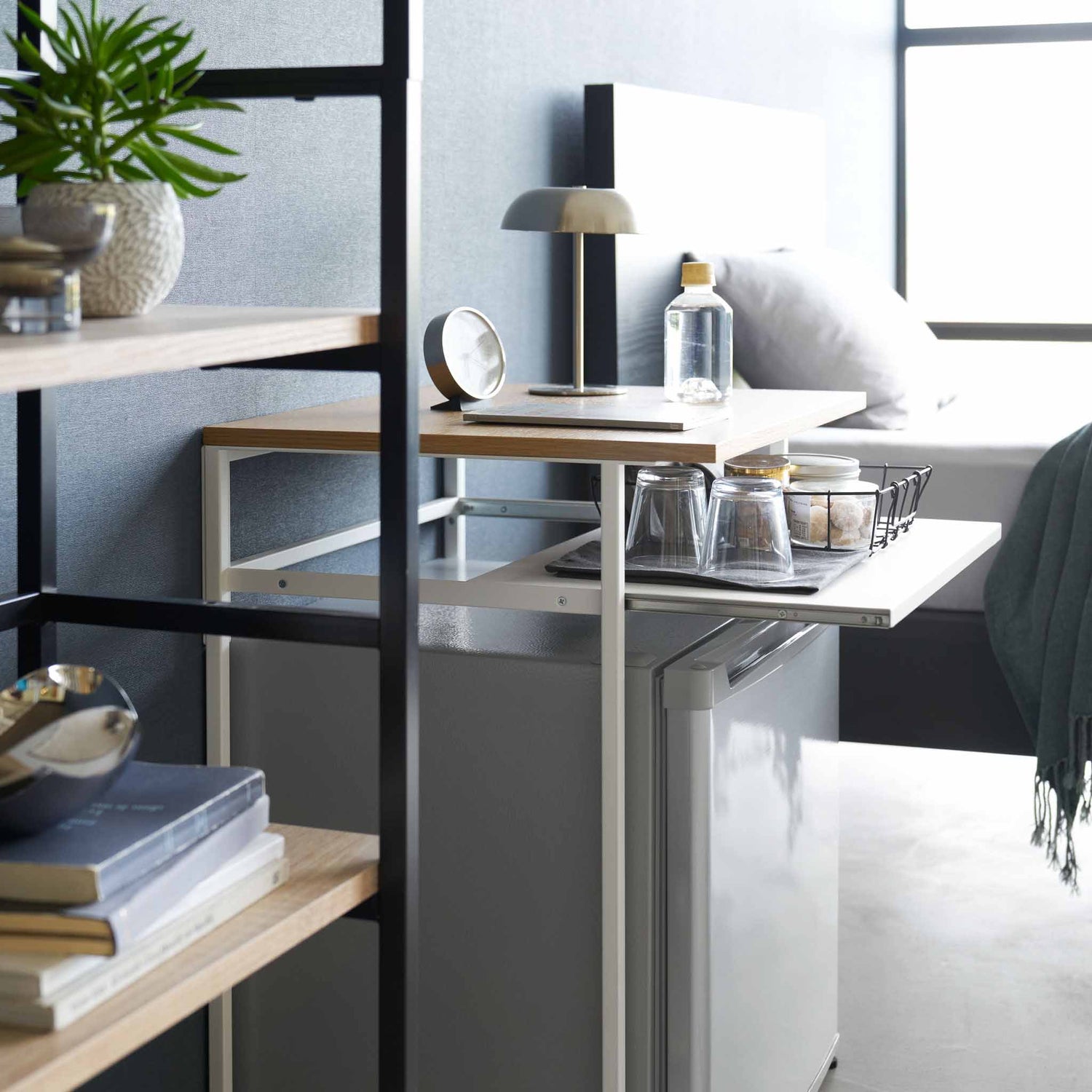 Bordplaten i tre gir en varm kontrast til den lette stålkonstruksjonen, mens den uttrekkbare hyllen gir ekstra plass når du trenger det. Skyv hyllen ut for en kopp kaffe, en laptop eller småting du vil ha lett tilgjengelig.