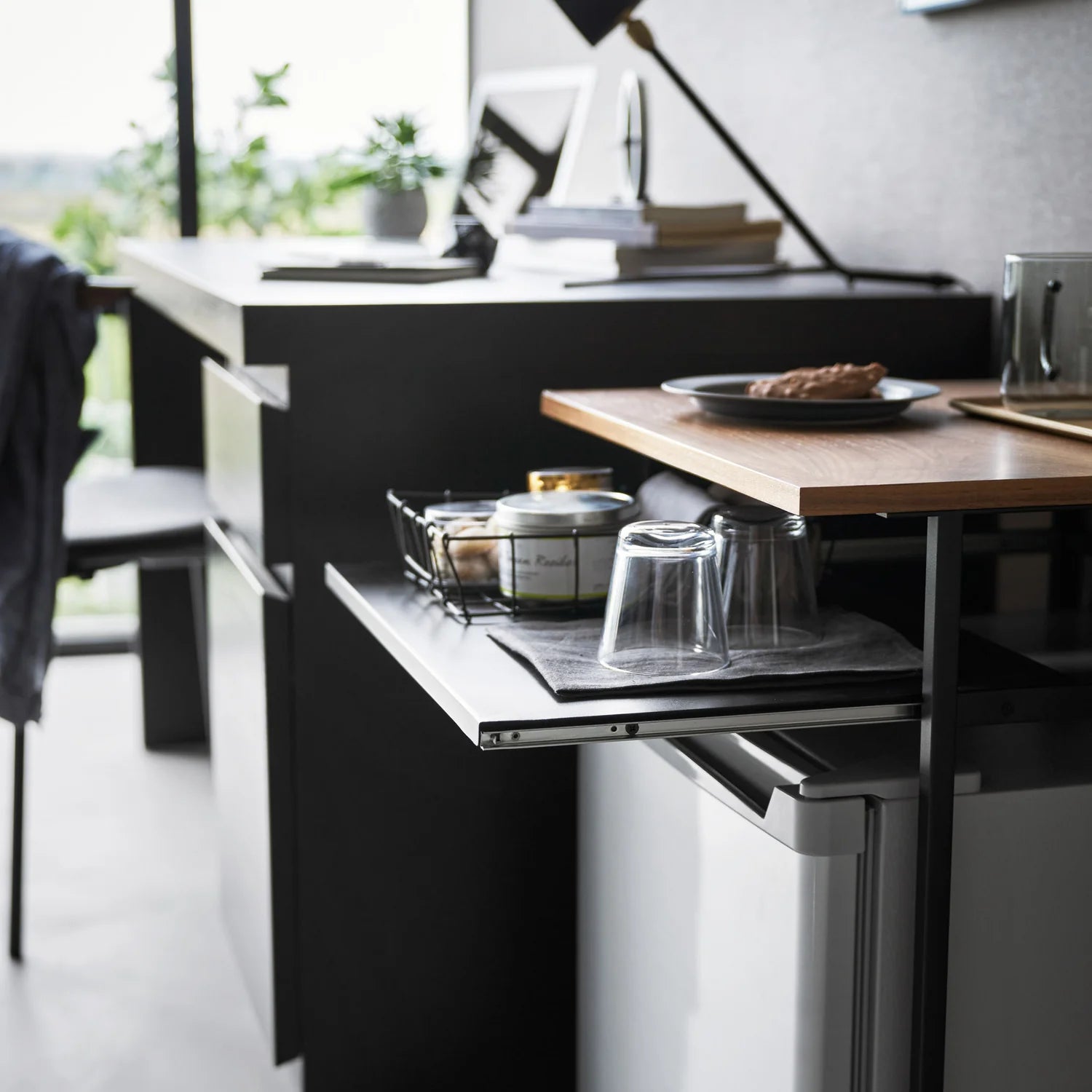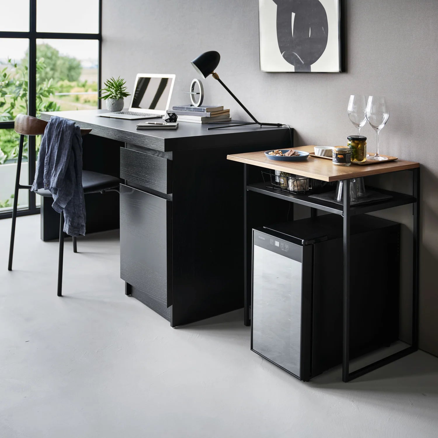 Gi rommet en smartere og mer fleksibel oppbevaringsløsning med et sidebord som kombinerer bordflate og ekstra hylleplass i ett. Denne modellen har sort stålramme og treplate på toppen, noe som gir et varmt uttrykk samtidig som den er praktisk i bruk på hjemmekontor, i stue eller på soverom.
