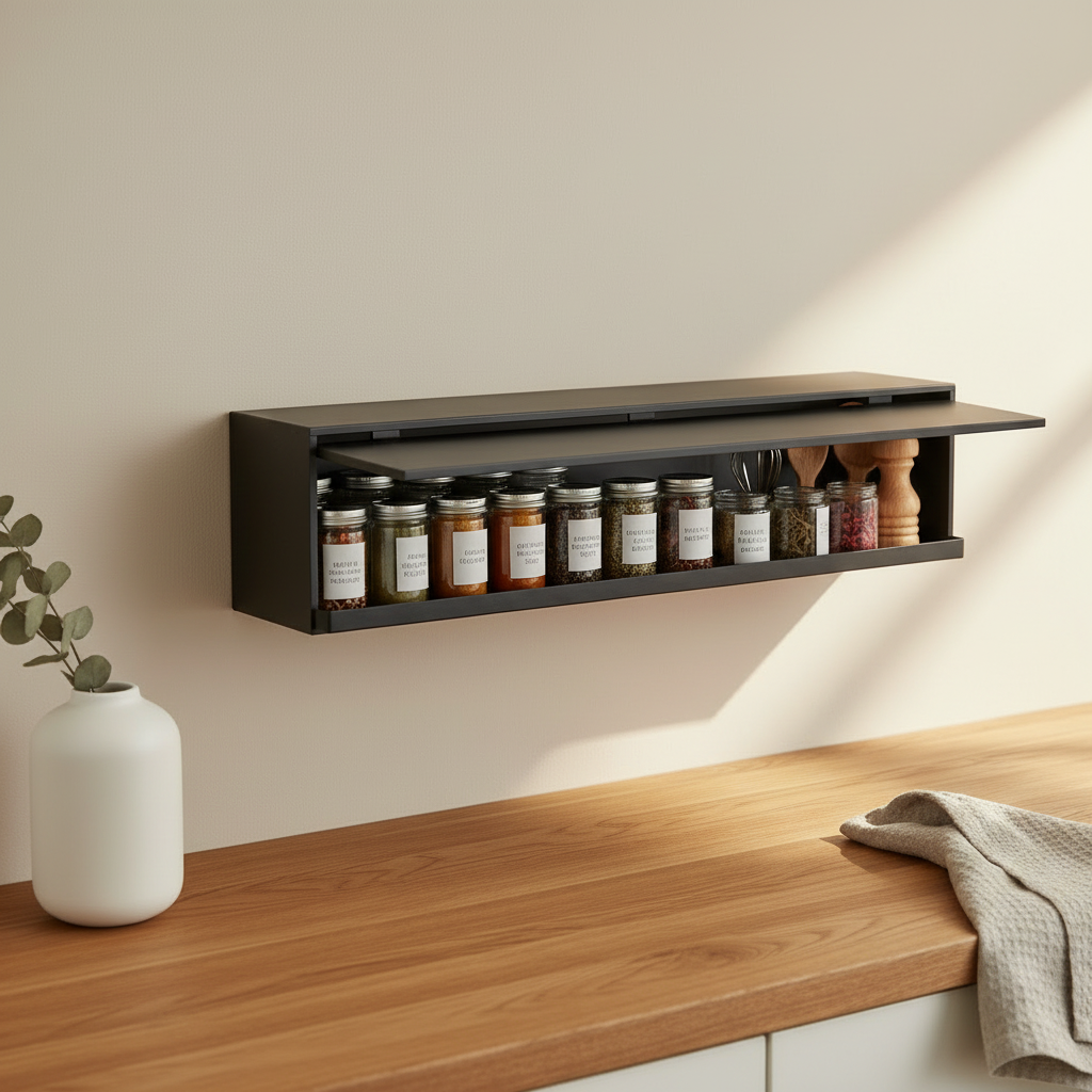 Smart oppbevaringsboks til vegg med en praktisk klaff som holder innholdet skjult. Perfekt størrelse til å gjemme ekstra doruller eller på kjøkkenet til krydder.