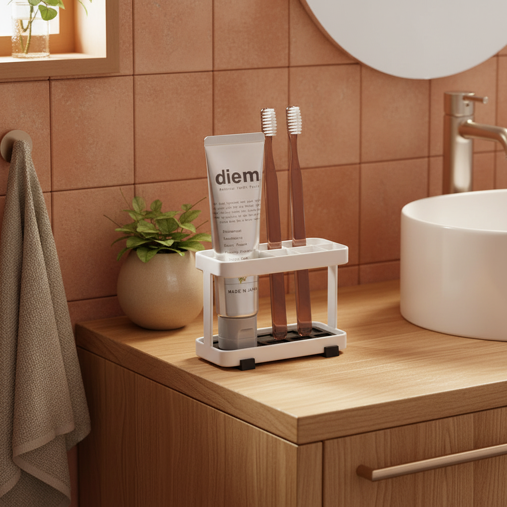 Nydelig tannbørstestativ i hvitt som gir enkel og hygienisk oppbevaring av tannbørster og tannkrem.