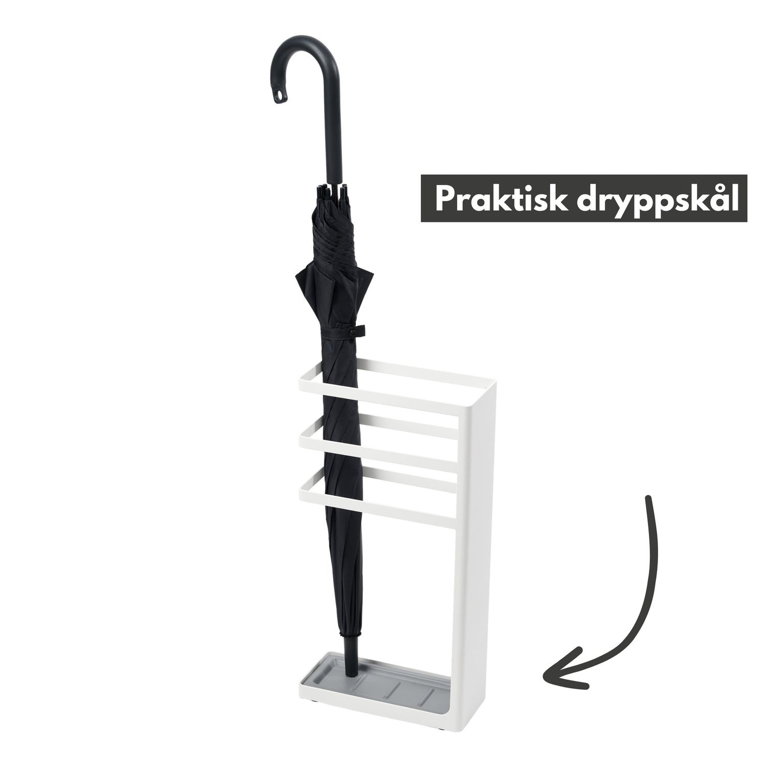 Designet i metall med en moderne, minimalistisk form, passer det perfekt i entré, kontor eller butikk. Stativet har flere ringer som holder paraplyene stående på plass, mens dryppskålen i bunnen fanger opp vann slik at gulvet holder seg tørt.