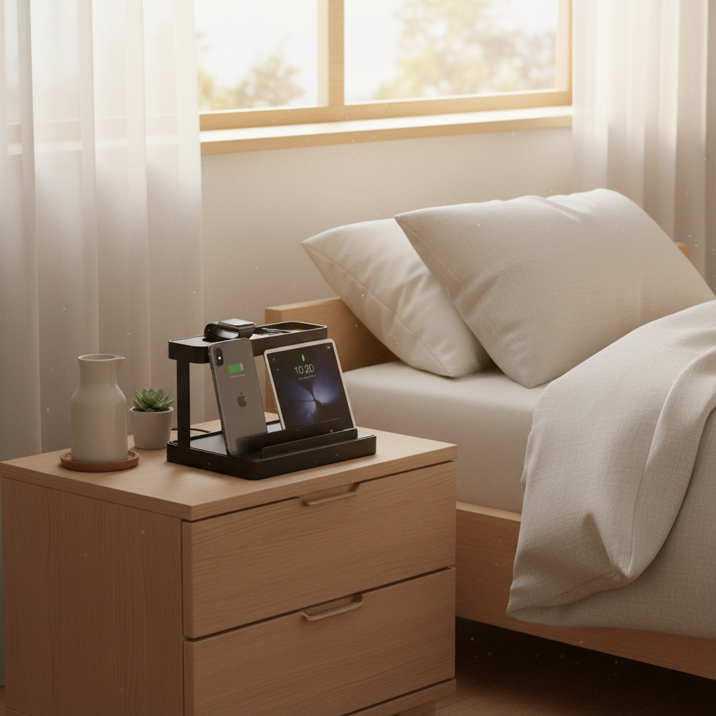 Stativet er laget for å organisere mobil, nettbrett og smartklokke i oppreist posisjon, slik at du får bedre oversikt på nattbord, skrivebord eller benk. Øvre brett har opphøyde kanter som holder tilbehør tryggere på plass, og du får både kabelåpning og silikonfelt til smartklokke. Smart organisering og lading i samme løsning gjør det enklere å holde orden på enhetene du bruker hver dag.