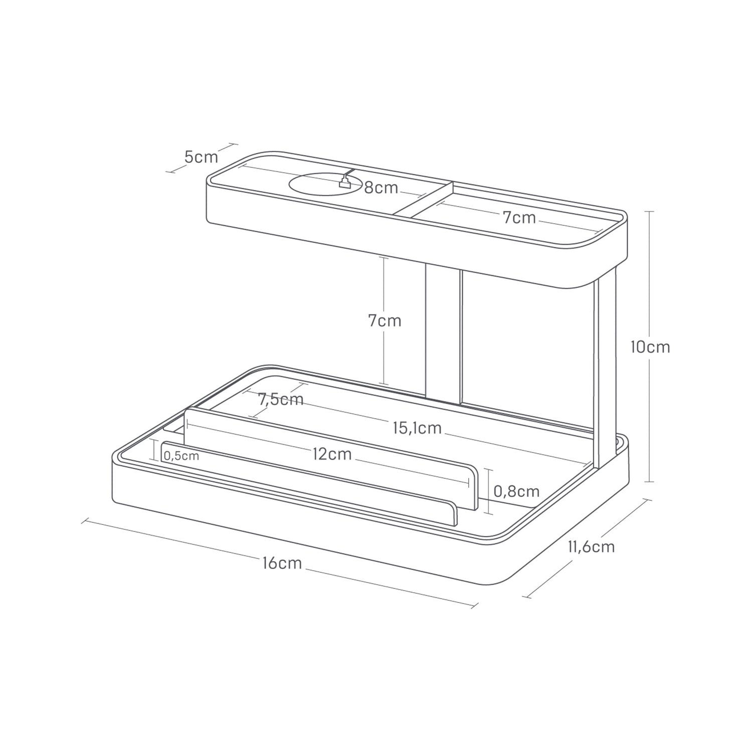 - Mål: bredde 16 cm, dybde 11,6 cm, høyde 10 cm