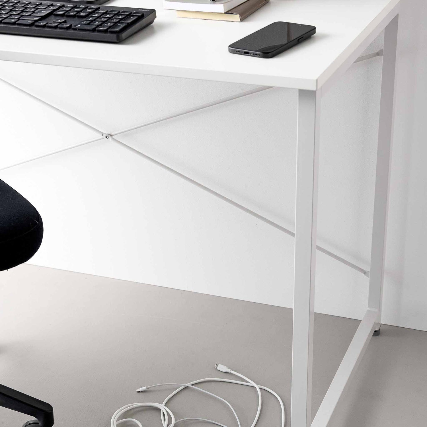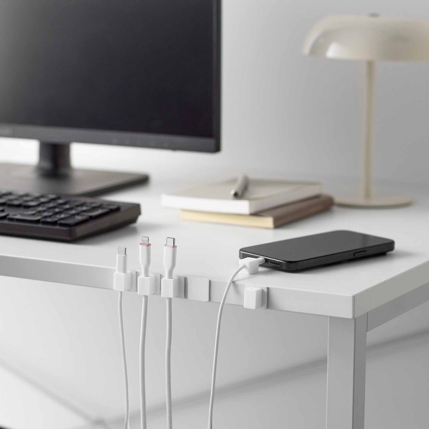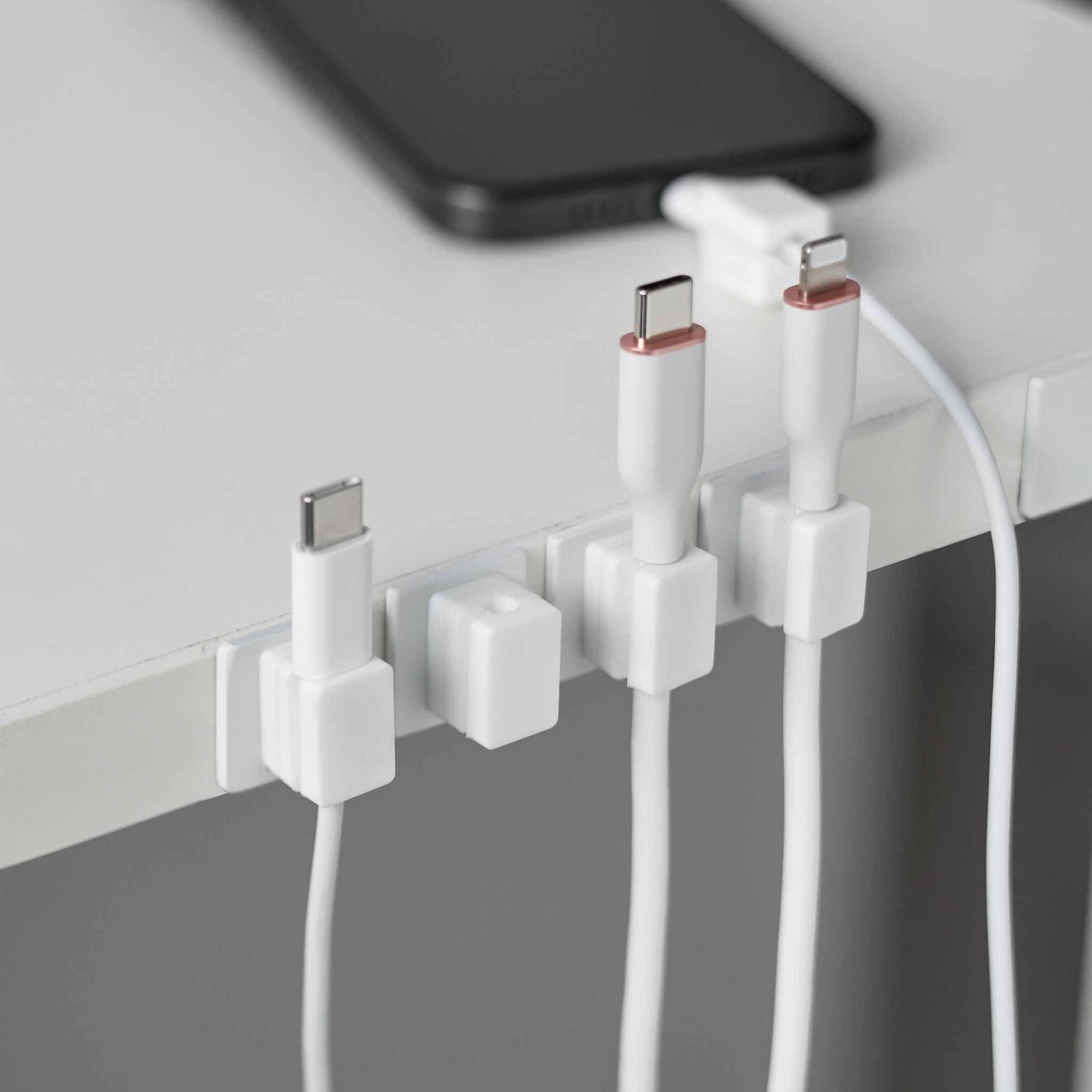 Hvite magnetiske kabelholdere med base for ryddig kabelstyring på skrivebord