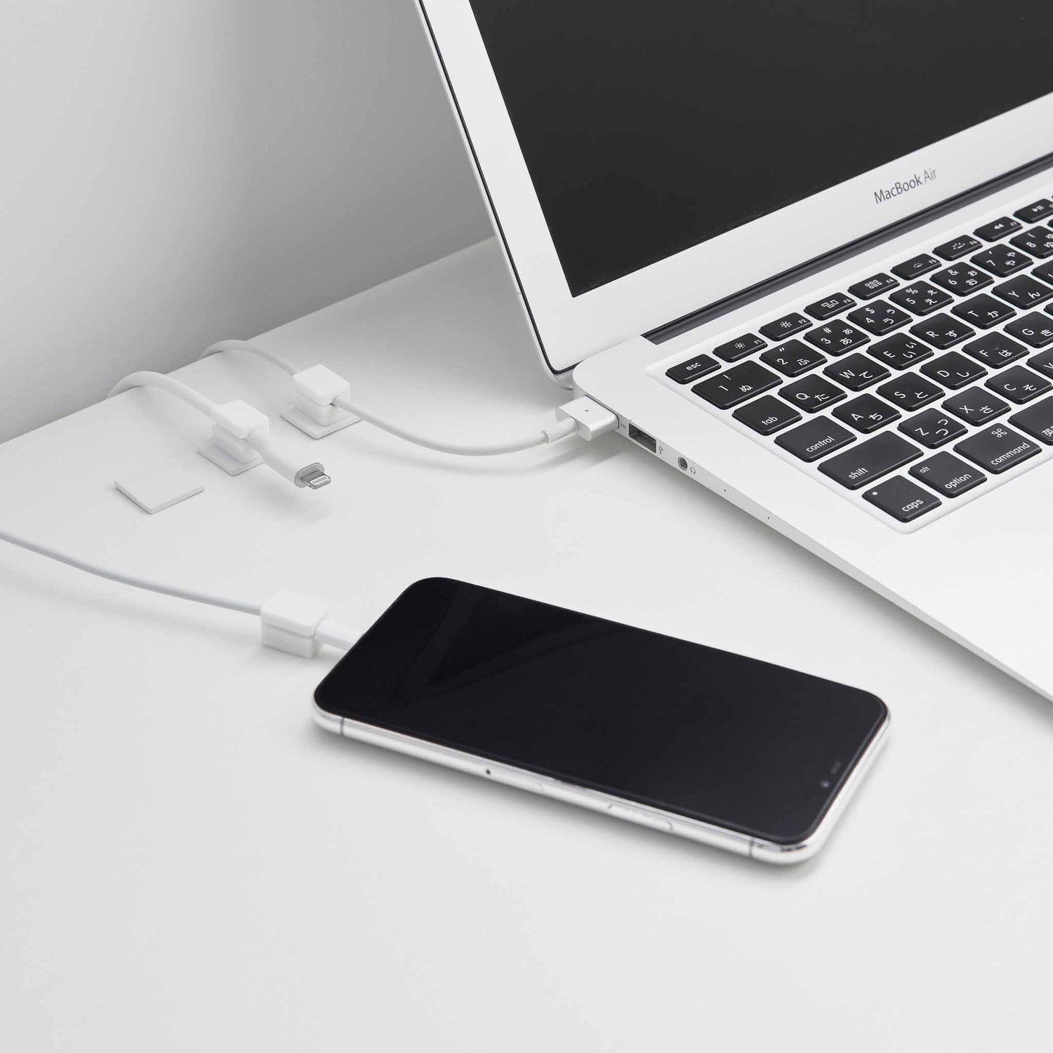 Settet består av fem kabelholdere i silikon med tilhørende baser i stål. Basene festes til underlaget med tape, og holderne klikker magnetisk på plass når du trenger dem. Magnetisk kabelstyring gjør det enkelt å samle og holde kabler tilgjengelige på skrivebord, nattbord, i bilen eller på hjemmekontoret.