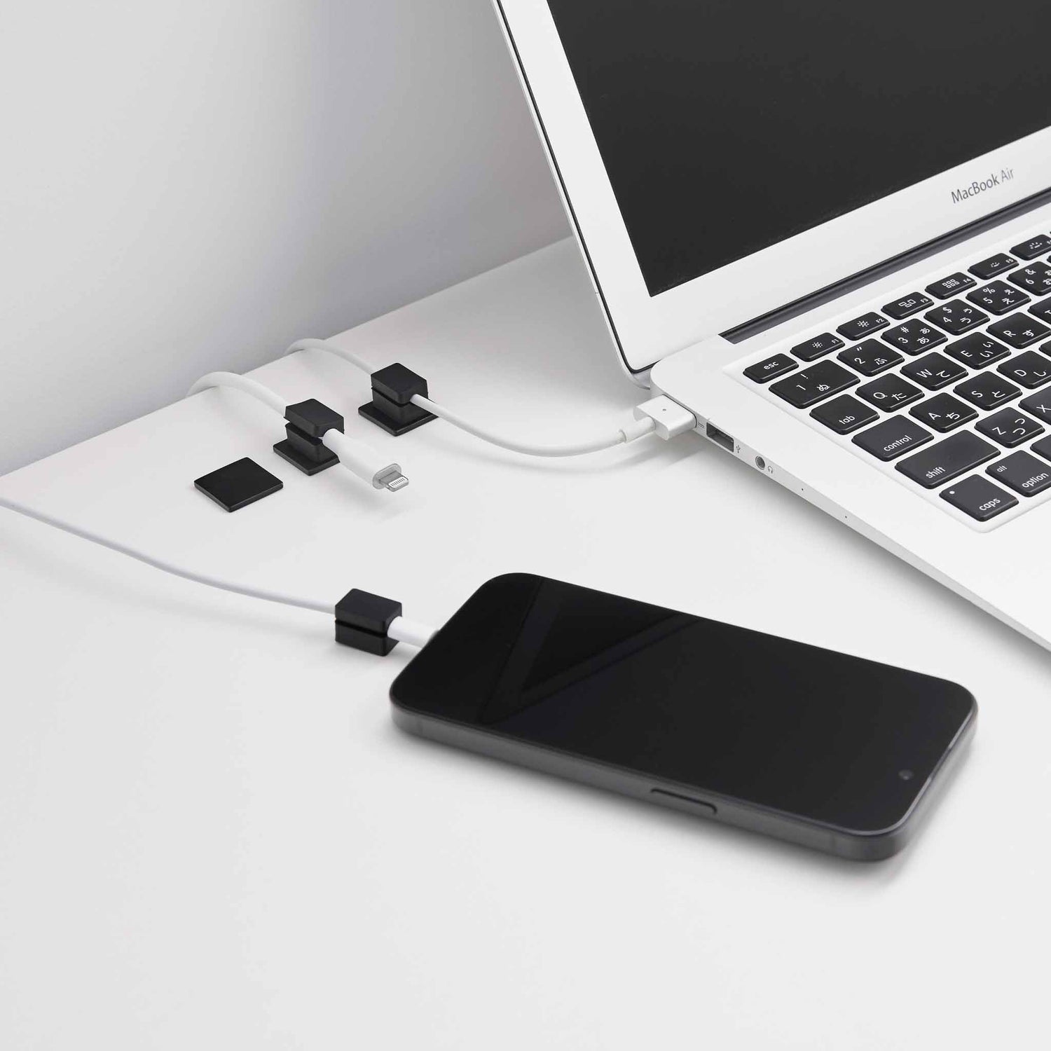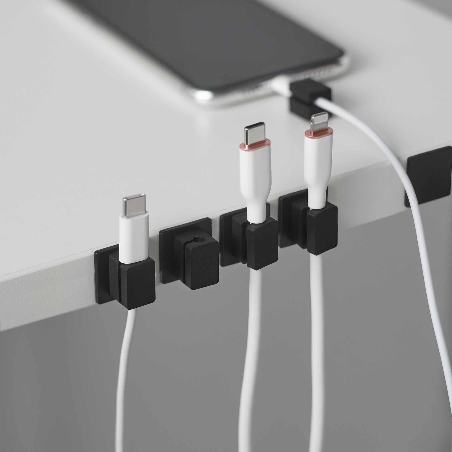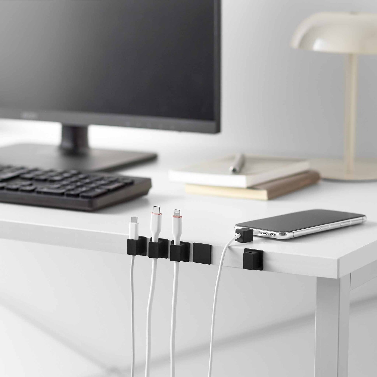 Settet inneholder fem kabelholdere i silikon med matchende baser i stål. Basene festes til underlaget med tape, og holderne festes magnetisk slik at du enkelt kan sette kabelen på plass og ta den av igjen ved behov. Magnetisk kabelstyring gjør det raskt å holde orden på ladekabler, USB kabler og andre små ledninger i hverdagen.