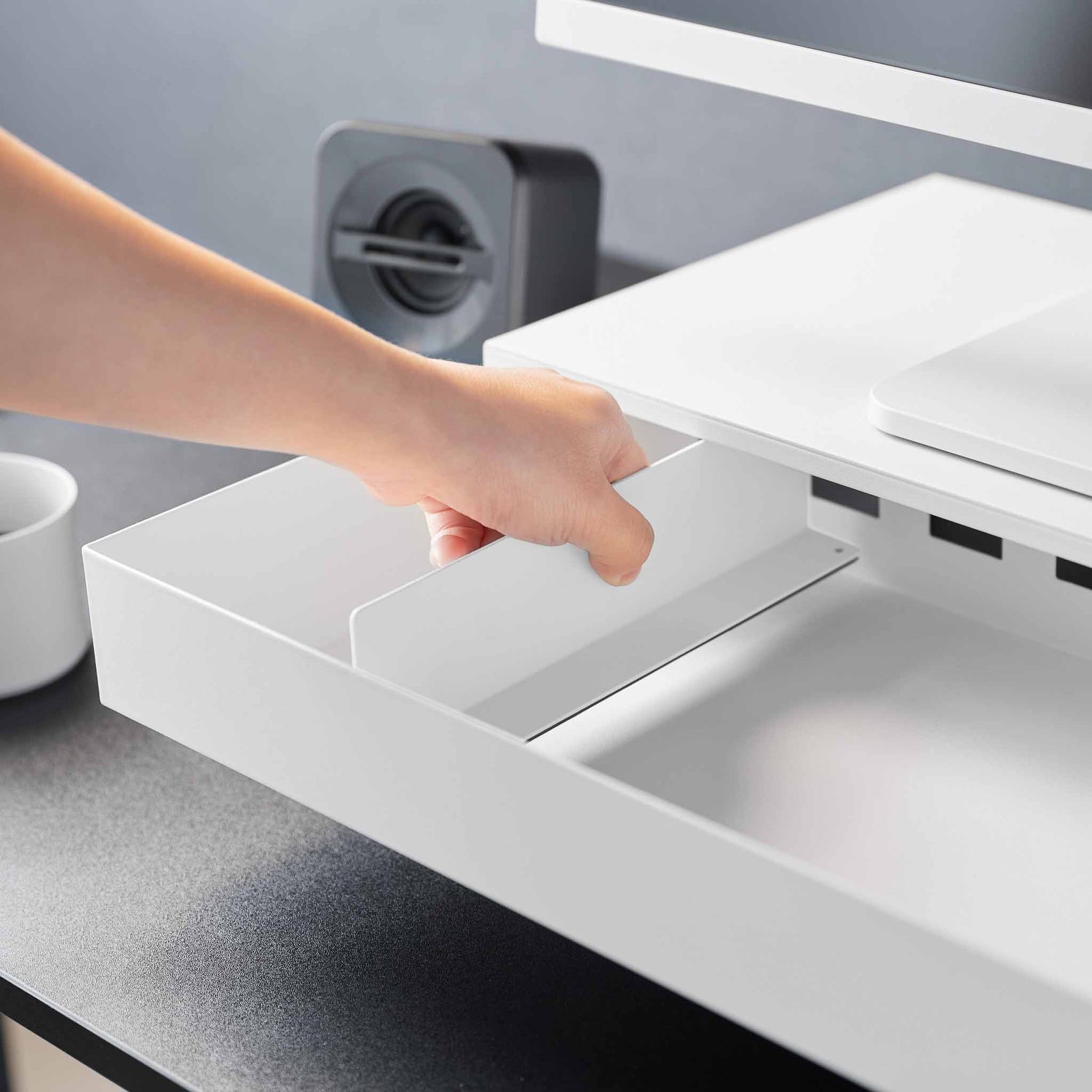 Stativet løfter skjermen opp fra bordet og gir plass til en integrert skuff med justerbar inndeling, slik at småting får en fast plass. Bak finner du utsparinger for kabler, og produktet leveres også med to magnetiske kabelholdere som bidrar til et mer oversiktlig oppsett. Hever skjermen til en mer komfortabel høyde samtidig som skuff og kabelstyring gir et ryddigere arbeidsområde.