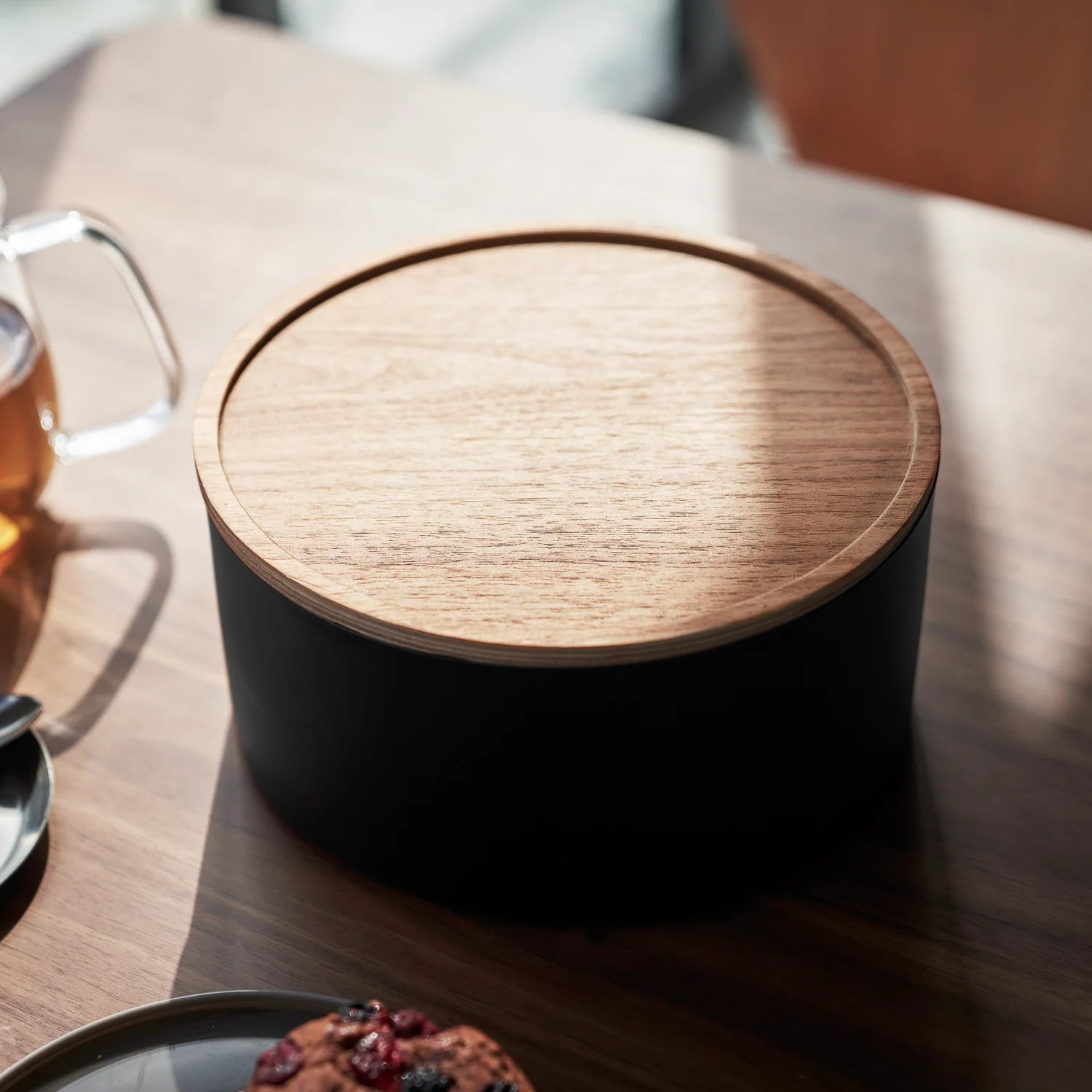 Dyp rund oppbevaringsboks i sort stål med trelokk på lys bakgrunn