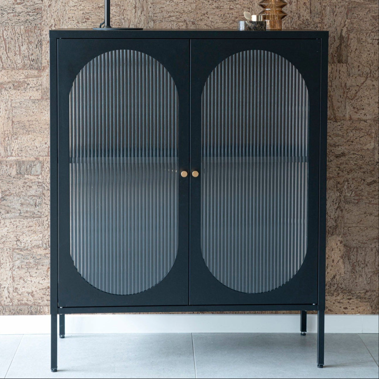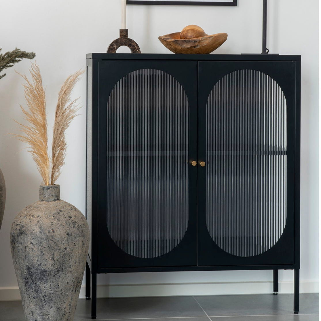 Adelaide Display Cabinet er et moderne vitrineskap. Den sorte metallrammen gir et stramt uttrykk, mens de to riflede glassdørene tilfører skapet et eksklusivt preg. Glassdørene skaper et spennende spill av lys og skygge, samtidig som de lar deg skimte innholdet på en diskret måte.