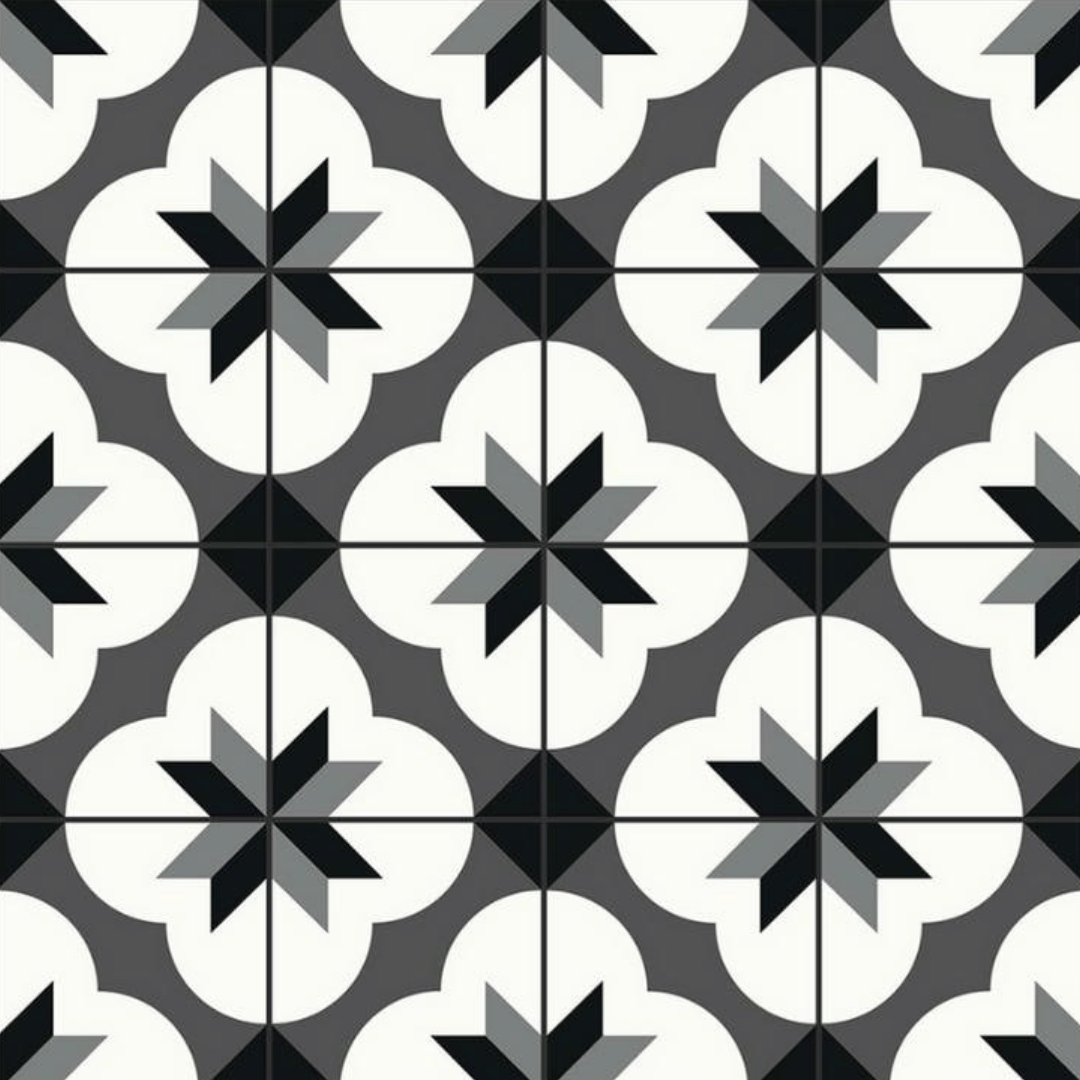 Bergen selvklebende fliser har et grafisk mønster med stjerneformer i sort og hvitt. Designet er inspirert av klassiske sementfliser og passer godt på både gulv og vegg.
