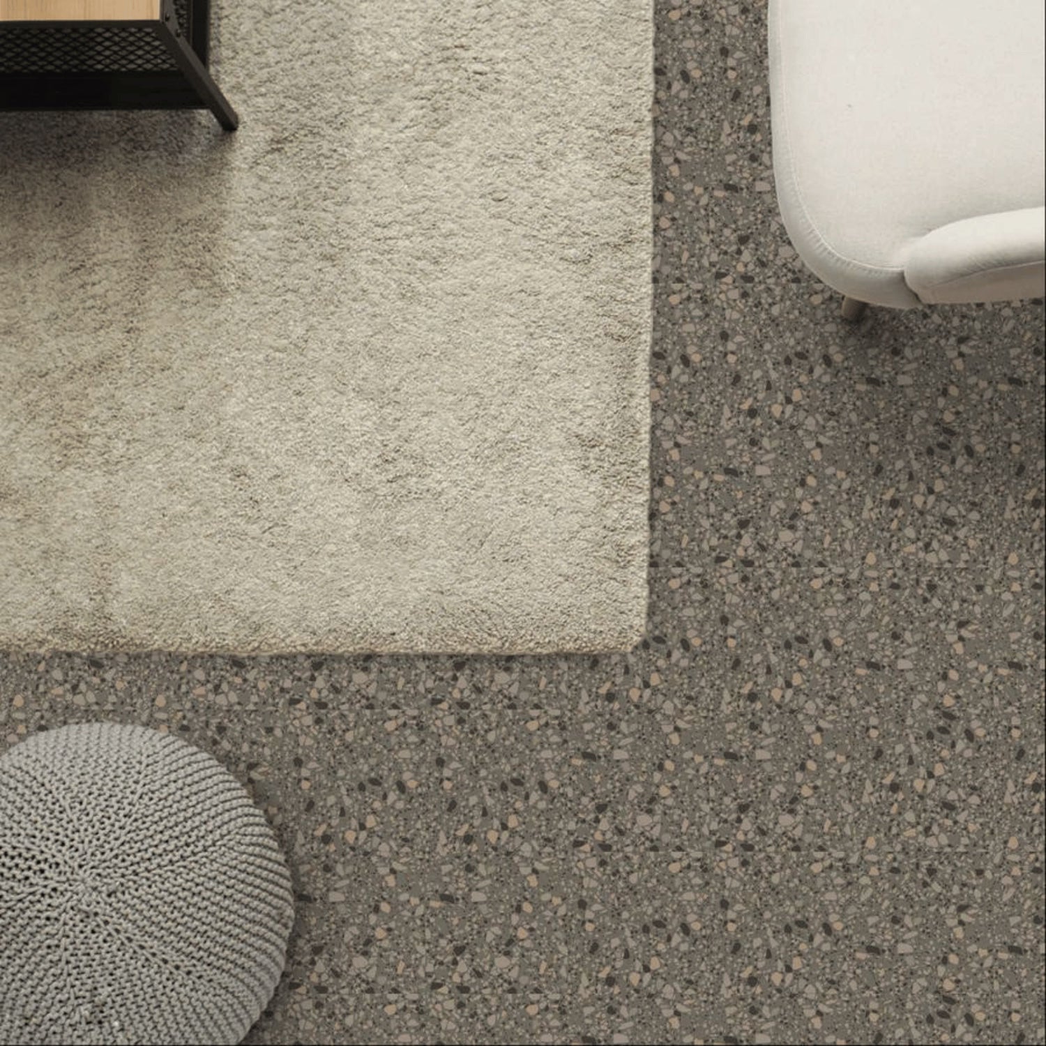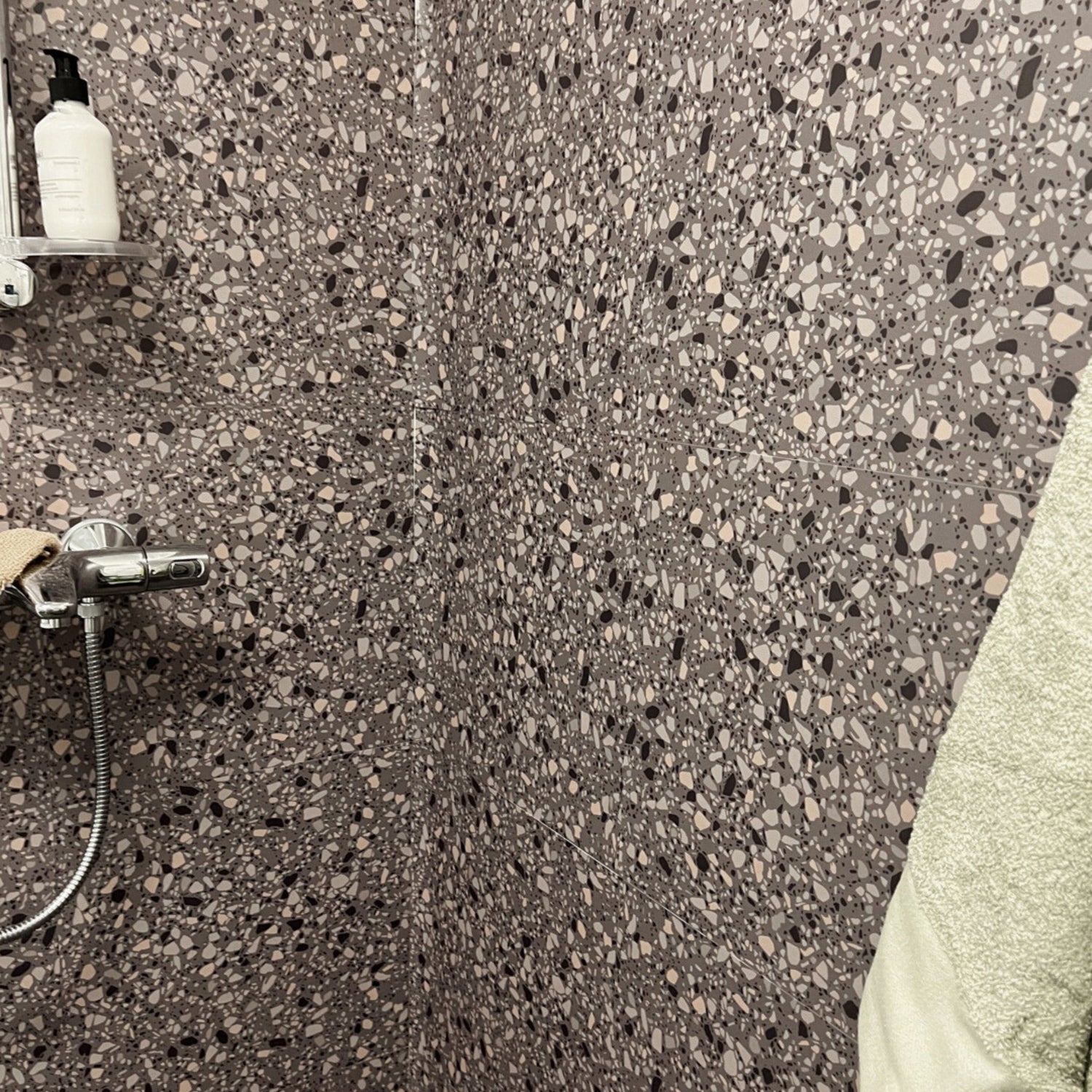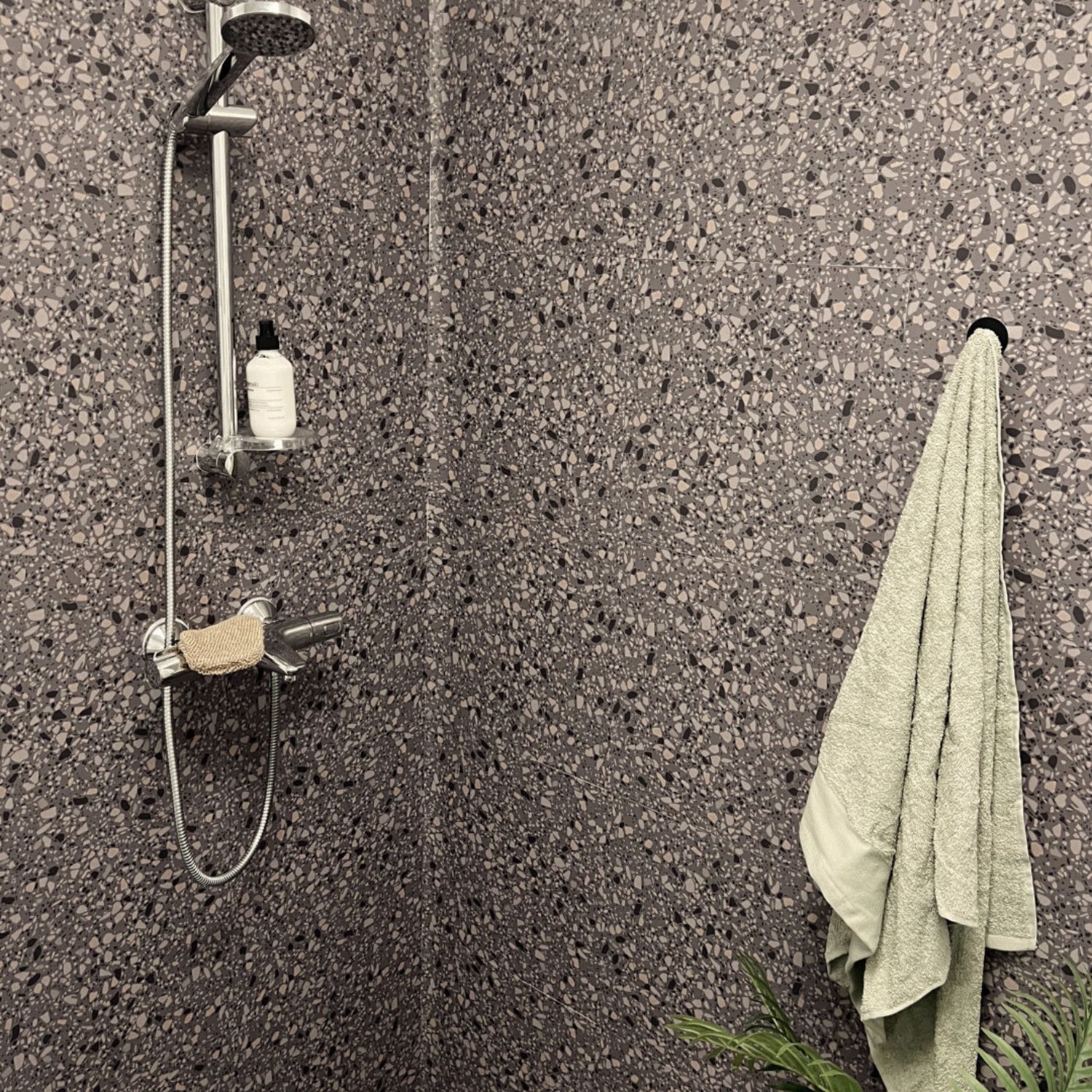 Den mørkere fargetonen gjør flisene spesielt godt egnet i dusj, på baderomsvegger eller i vaskerom der du ønsker en mer markert og eksklusiv overflate. Terrazzo-mønsteret skjuler også vannsprut og små merker godt i daglig bruk.