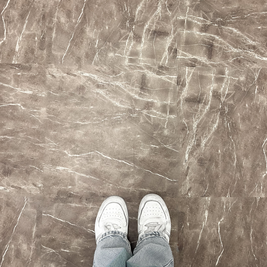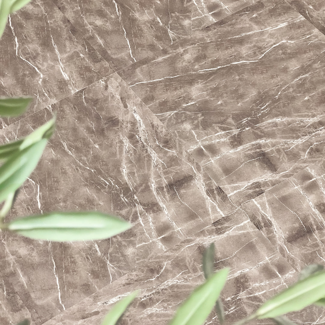 Havana selvklebende fliser har et marmorinspirert design i varme bruntoner med lyse årer som gir overflaten et naturlig steinpreg. Mønsteret skaper variasjon i flaten og gir et uttrykk inspirert av klassisk naturstein.