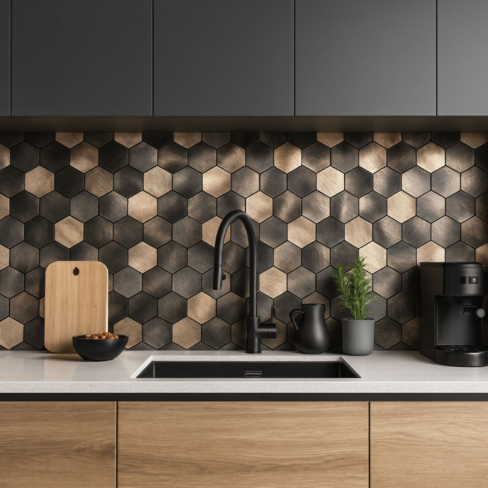 Moderne kjøkken med svart og Latte hexagon selvklebende fliser på vegg, kombinert med eikefronter og sort armatur
