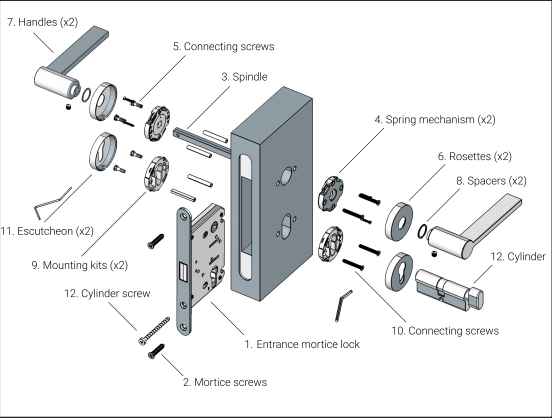 - Pakken inneholder: dørhåndtak, nøkkelskilt, låsekasse, låsesylinder, nøkler, skruer.
