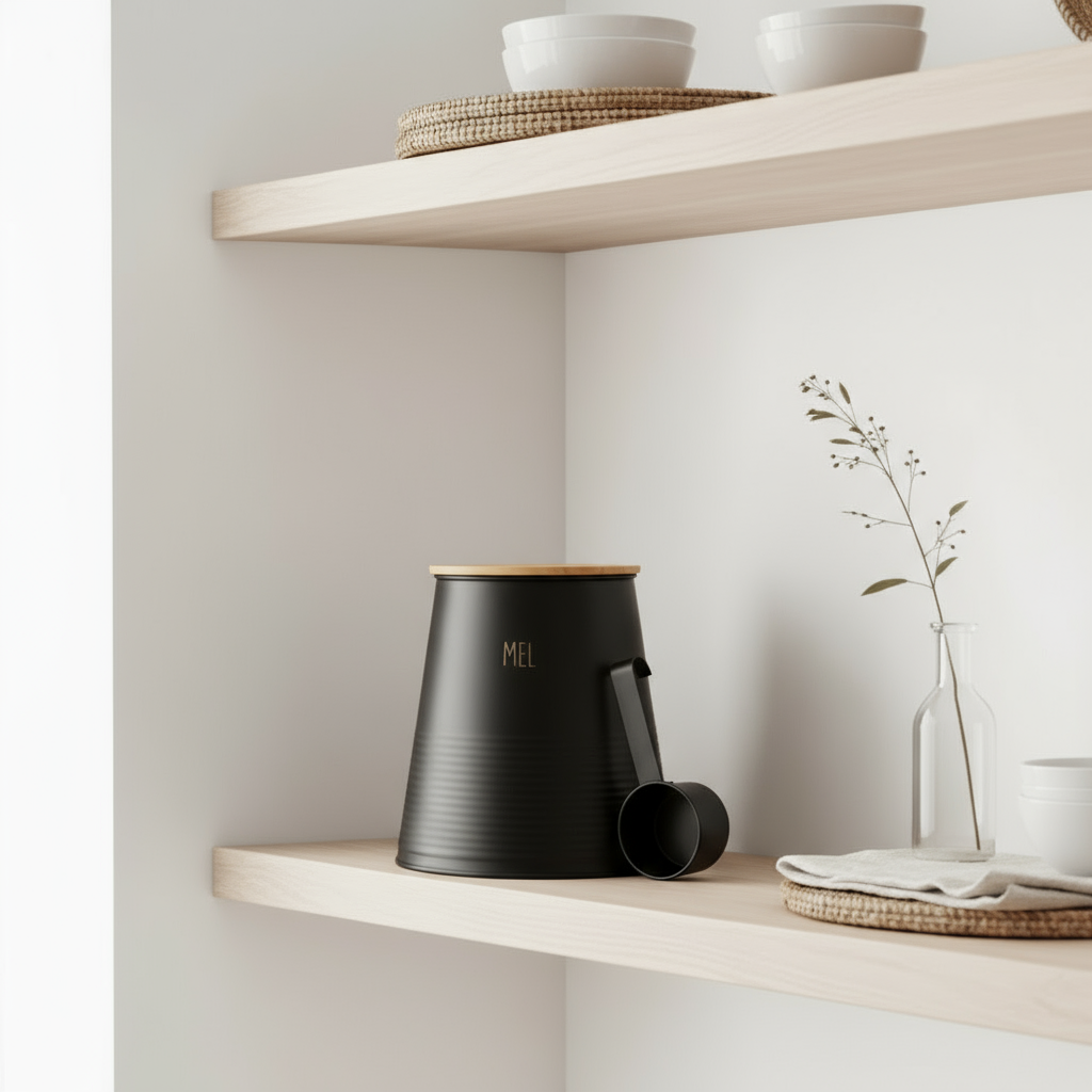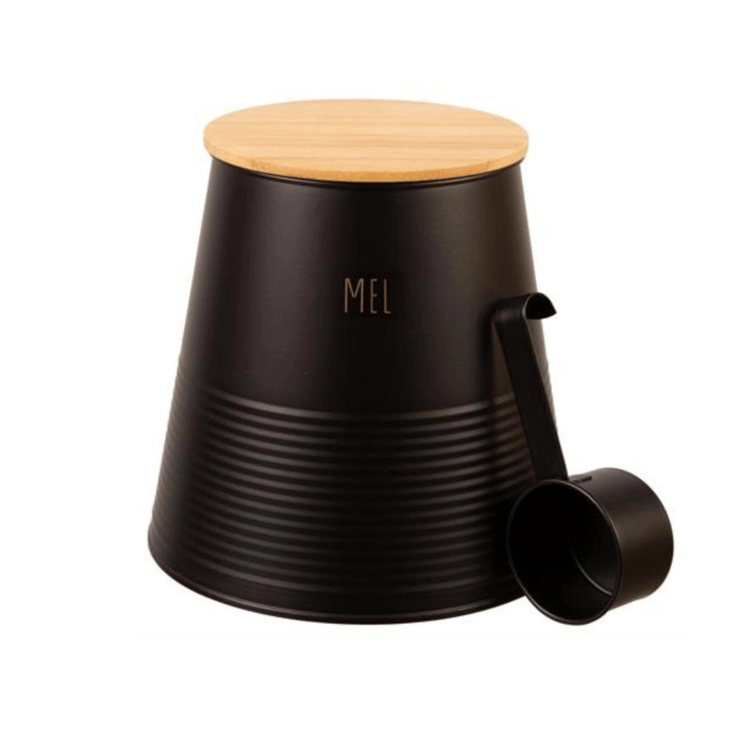 Hold kjøkkenet ryddig med denne boksen til mel i sort metall. Boksen har bambuslokk som holder melet ferskt, og en praktisk skje som festes på siden.