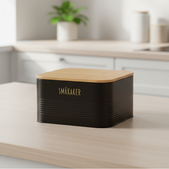 Boks til småkaker i sort metall med bambus lokk. Denne boksen er tett slik småkakene holder seg sprø. Boksen har en moderne sog stilful look og ser flott ut på kjøkenbenken.