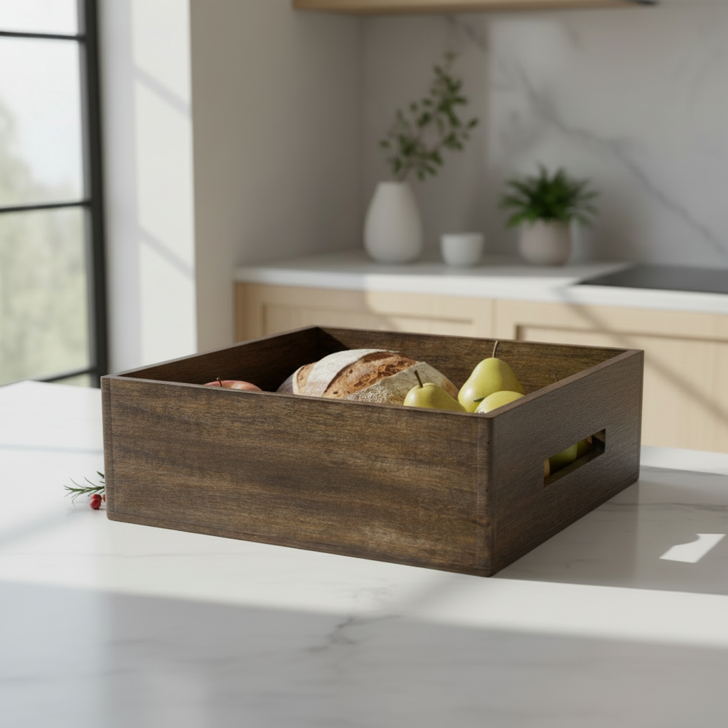 Denne håndlagde kurven i mangotre kombinerer funksjonalitet med organisk skjønnhet. Den mørke sort/brune finishen fremhever trevirkets naturlige tekstur og gir en varm, eksklusiv følelse til interiøret.