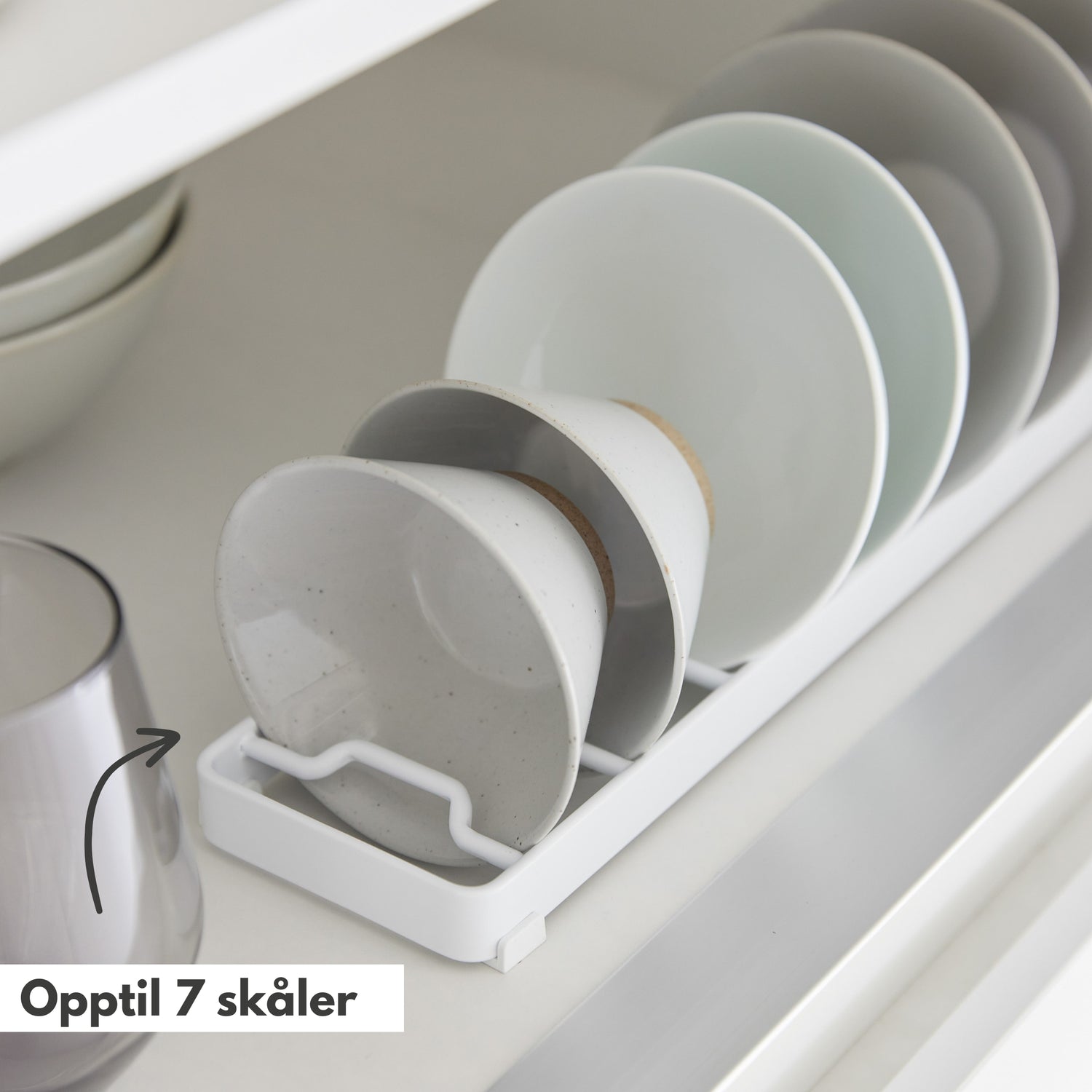 Dette skålstativet holder skåler og kopper trygt på plass og gjør det enklere å holde orden i skap og hyller. Stativet rommer opptil sju skåler, avhengig av størrelse, og lar deg oppbevare dem side om side slik at de er lett tilgjengelige.