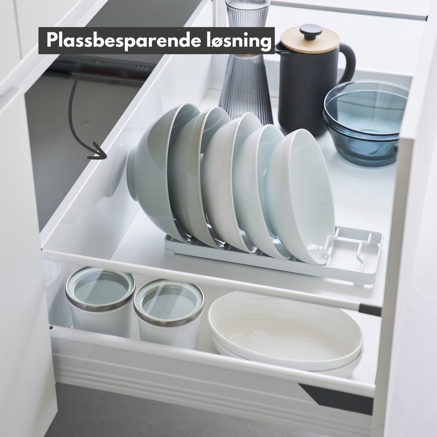 Stativet har plass til opptil seks skåler, avhengig av størrelse og form, og er utstyrt med silikonføtter som sørger for stabilitet og beskytter mot riper. En plassbesparende løsning som holder kjøkkenskap og hyller ryddige og oversiktlige.