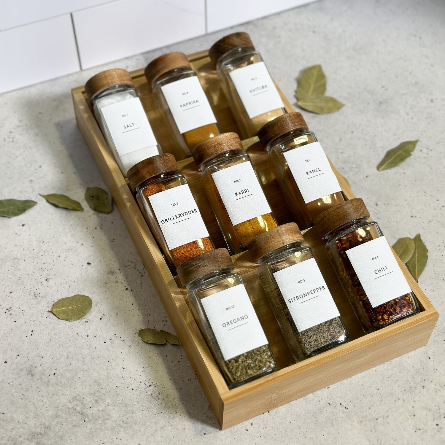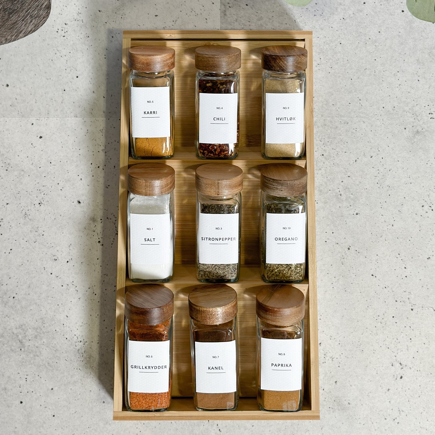 Skuffinnsats i tre til krydder. Passer perfekt i krydderskuffen eller på kjøkkenbenken som dekorasjon. Oppbevar krydderet ditt på en ryddig og stilfull måte. Skuffeinnsatsen passer til 9 stk krydderglass. Krydderglass kjøpes separat.