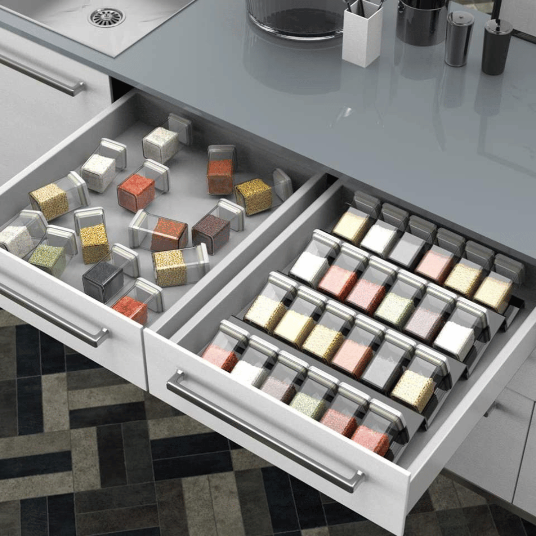 Skuffeinnsats for krydder. Passer perfekt i krydderskuffen eller på kjøkkenbenken som pynt. Oppbevar krydderne dine på en ryddig og stilig måte. Denne praktiske skuffeinnsatsen kommer i fire deler slik at du kan justere radene selv etter dine behov. Perfekt for deg som ønsker et organisert og ryddig kjøkken.