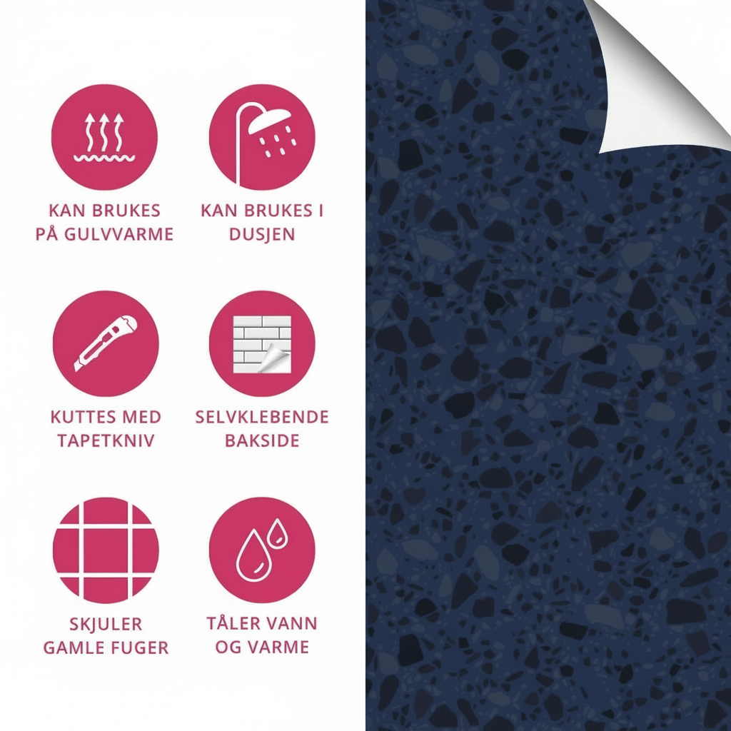 Har du lyst på nytt gulv på badet? Eller kanskje du har lyst på nye fliser i dusjen? Endelig er løsningen her! Disse innovative selvklebende flisene kan festes rett på ditt gamle underlag, til og med på gulv med varme, laminat og i dusjsonen. Ja - du leste riktig! Disse flisene kan brukes på alle slette underlag på både vegg og gulv.