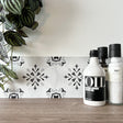Amilia selvklebende fliser har et historisk design i hvit, grå og sort.