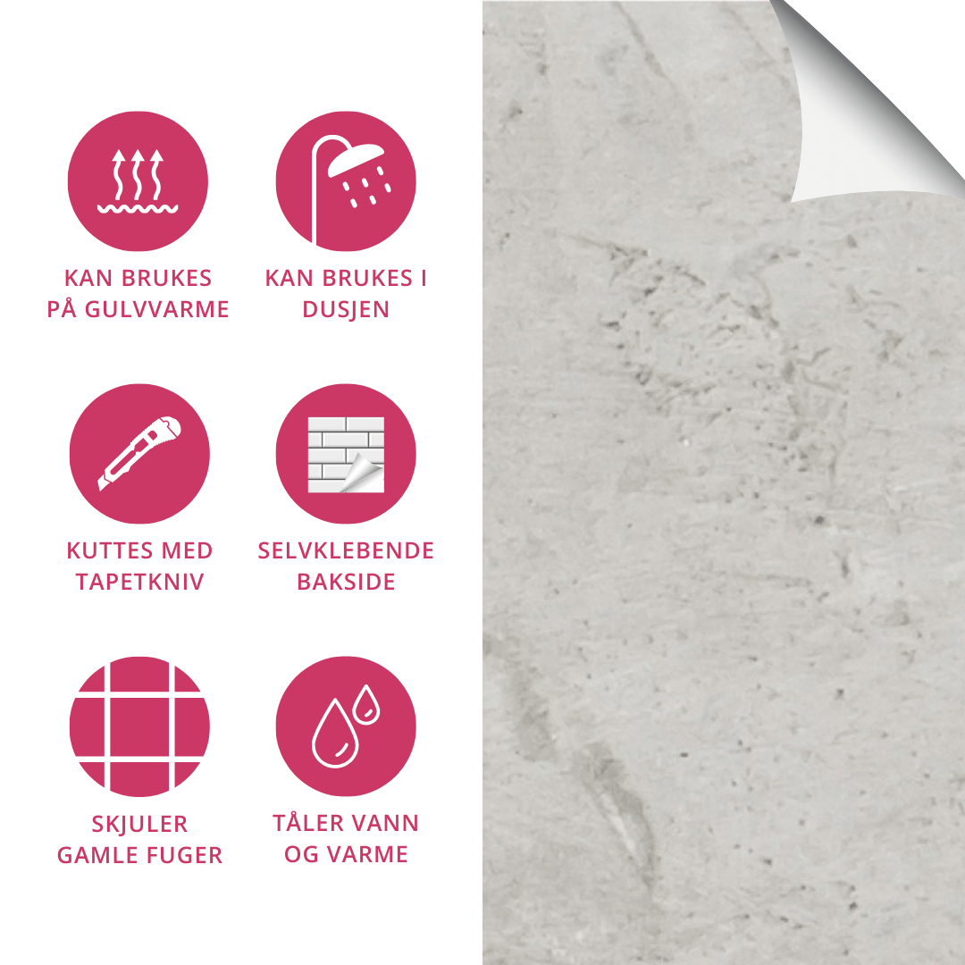 Har du lyst på nytt gulv på badet? Eller kanskje du har lyst på nye fliser i dusjen? Endelig er løsningen her! Disse innovative selvklebende flisene kan festes rett på ditt gamle underlag, til og med på gulv med varme, laminat og i dusjsonen. Ja - du leste riktig! Disse flisene kan brukes på alle slette underlag på både vegg og gulv