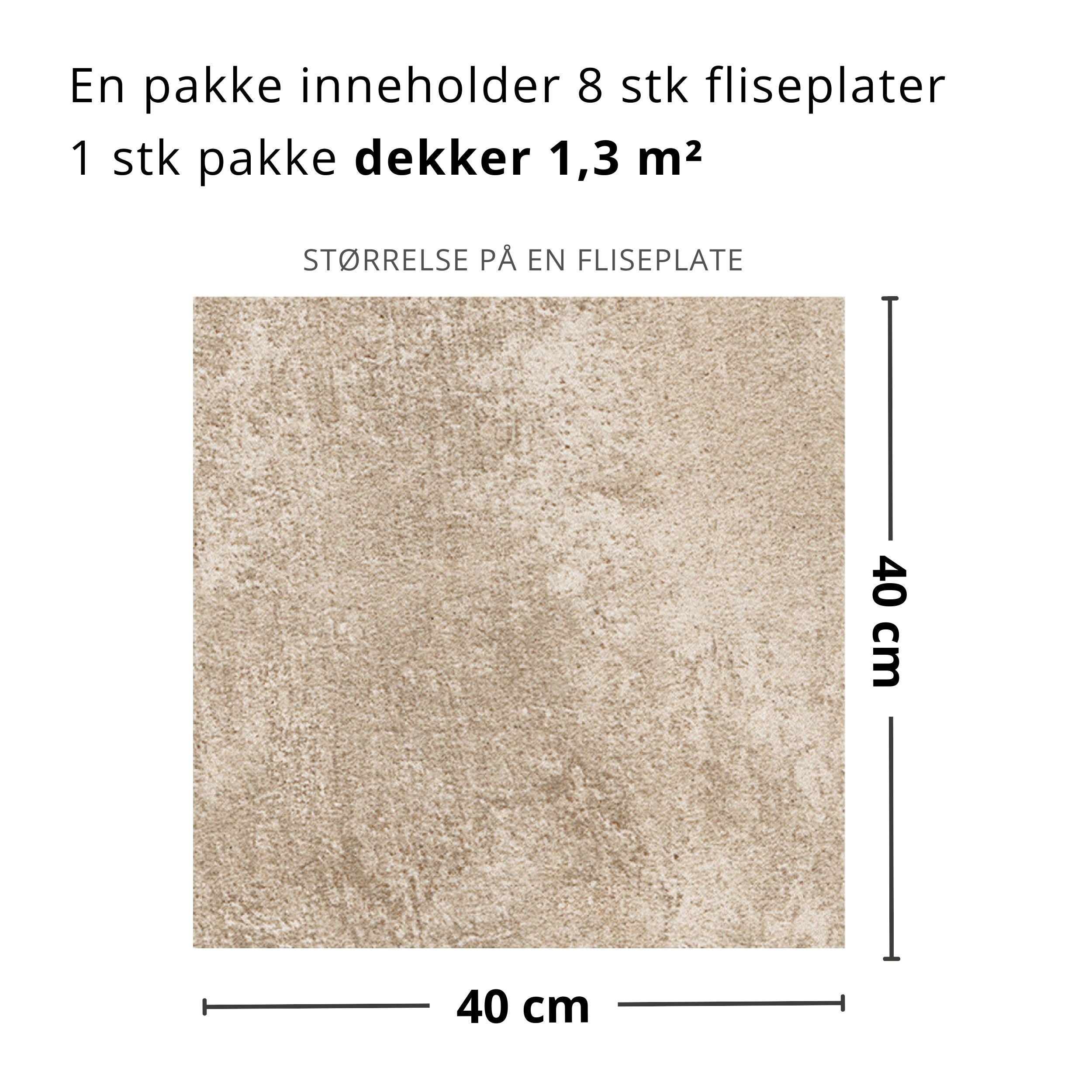 Flisene monteres enkelt uten fug eller spesialverktøy. Bare fjern beskyttelsesfilmen og trykk på plass. Resultatet er en vakker, varig og vedlikeholdsfri overflate på få minutter.