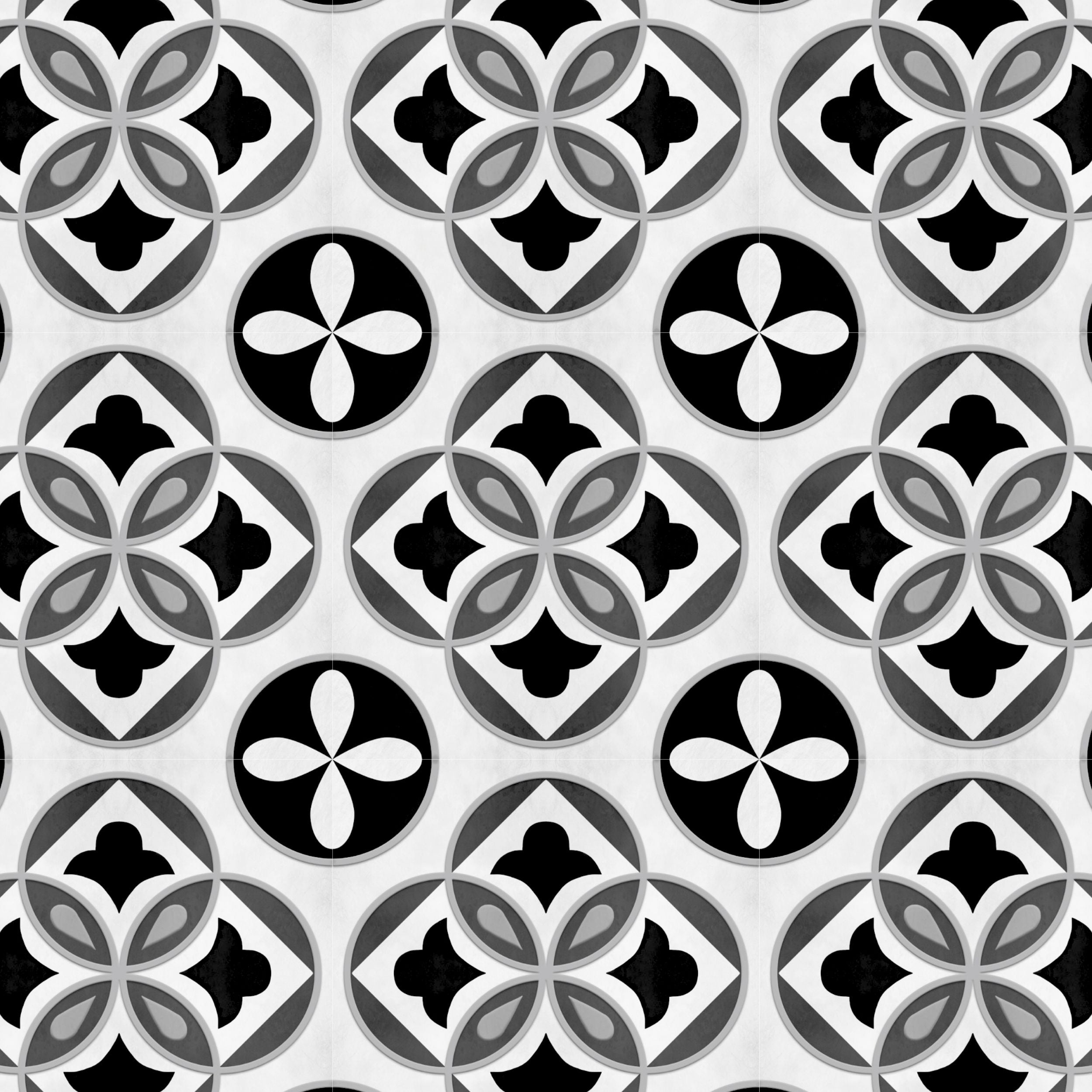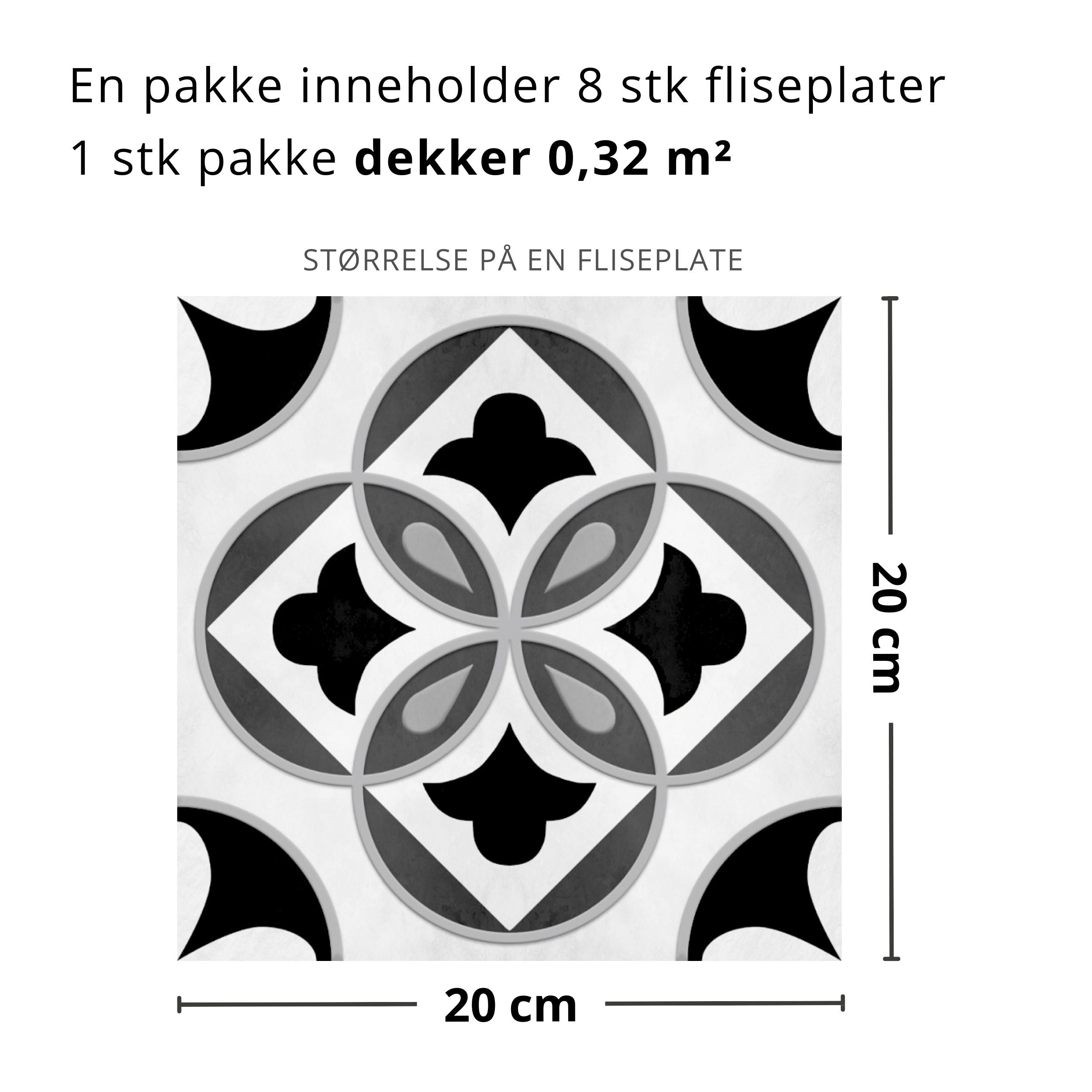 Clara grå selvklebende fliser imiterer et klassisk mønster i sort, hvitt og grå toner. Passer godt til gang, toalett eller baderom.